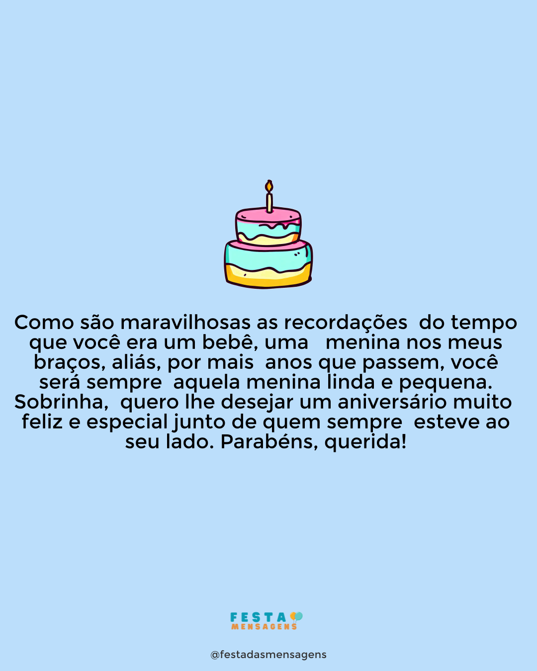 Nos conhecemos através da família e desde cedo nos tornamos inseparáveis. De prima você se tornou em irmã de pais diferentes, e por isso custa tanto que hoje esteja tão longe de mim. Sinto muitas saudades suas e do tempo em que compartilhávamos tudo, e em especial hoje lamento não poder lhe dar um abraço e um beijo de parabéns. Feliz aniversário! Mas esteja você onde estiver, passe o tempo que passar e aconteça o que acontecer, eu para sempre vou amar você igual, pois é minha irmã de coração. Nossa ligação é para toda vida, nossa amizade é eterna, e tudo que eu desejo é que você esteja bem e feliz. Parabéns, minha prima-irmã! Seja feliz, hoje e sempre, e nunca se esqueça que eu a amo muito!