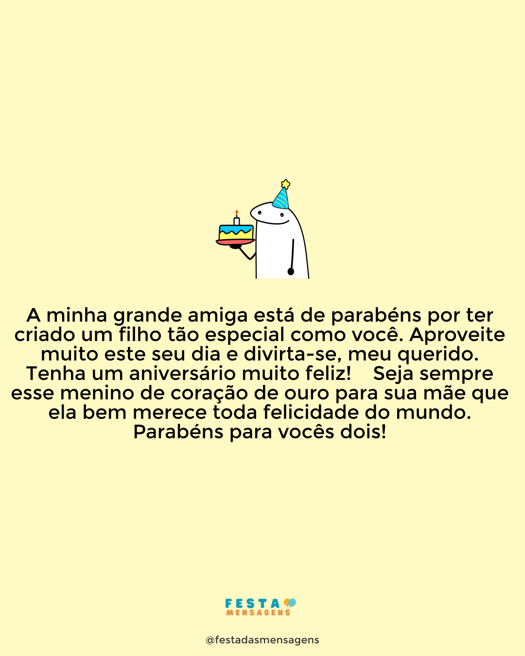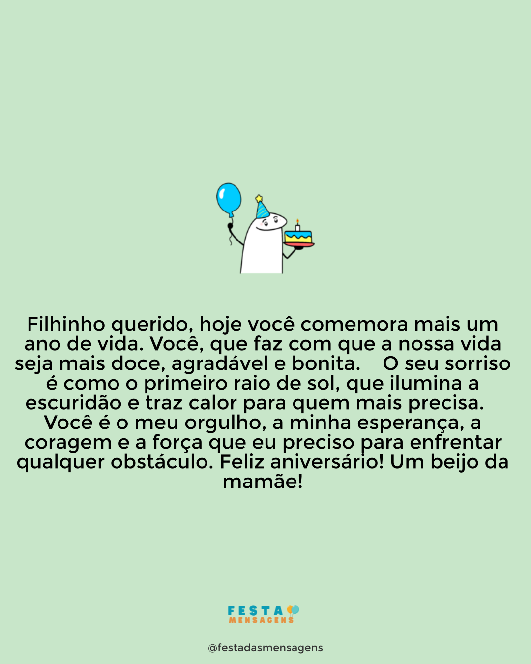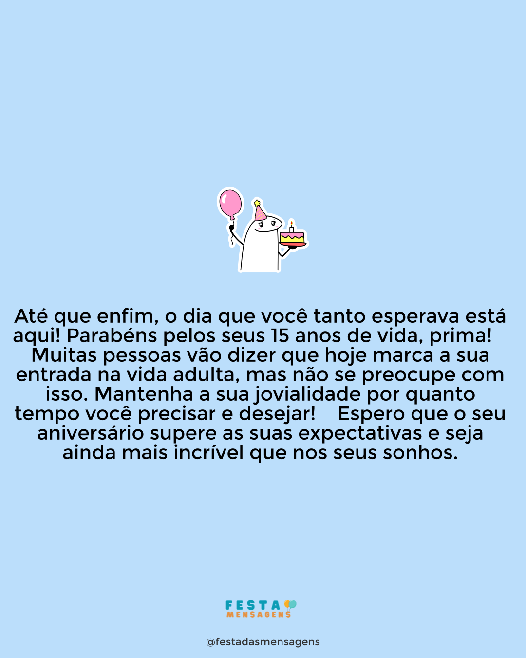 Você está completando 17 anos de vida e estou aqui para dizer que espero que seja um momento muito especial. Comemore muito e aproveite cada segundo deste dia que é tão importante. Agora, você já é quase um adulto e com isso, chegam novas responsabilidades. Sei que você vai honrar sua idade e ter muito foco e determinação para se tornar uma pessoa incrível. Parabéns pelo seu dia!