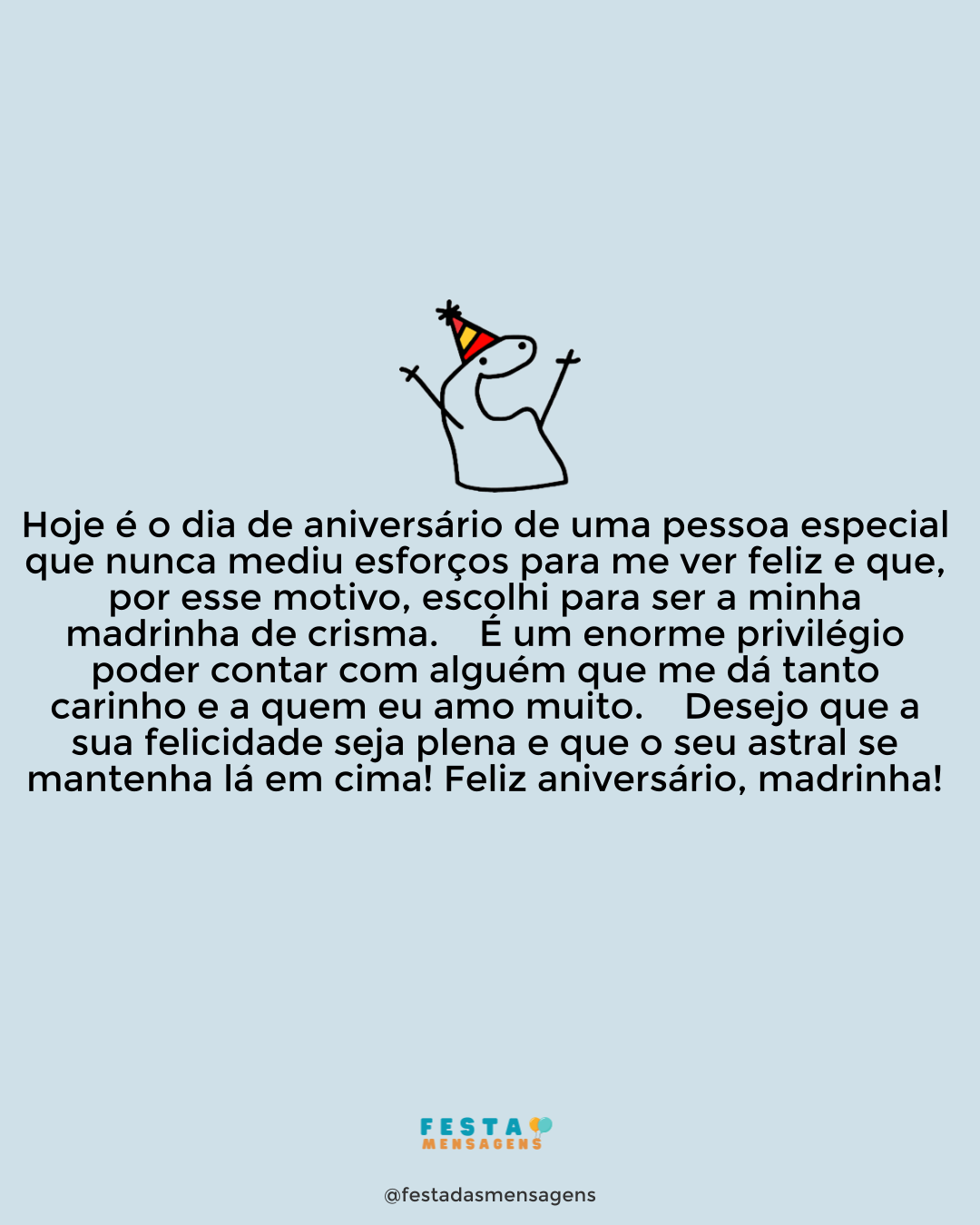 Parabéns, querida! Tenha um aniversário feliz. Quando eu assumi a responsa-bilidade de ter você como afilhada de crisma, eu nem hesitei. É um grande privilégio estar ligada a você, seja de que forma for. Hoje, o dia é diferente, mas eu estarei igualmente ao seu lado. Aproveite seu aniversário! Curta seu grande dia com a mesma alegria de sempre, com o mesmo sorriso, com a certeza que tudo vai ser maravilhoso. Além de presentes maravilhosos, eu tenho certeza que você irá receber uma verdadeira bênção do Senhor. Ele nunca se esquece, especialmente em datas como esta. Parabéns, querida, por mais um ano de vida! Eu gosto muito, muito de você.