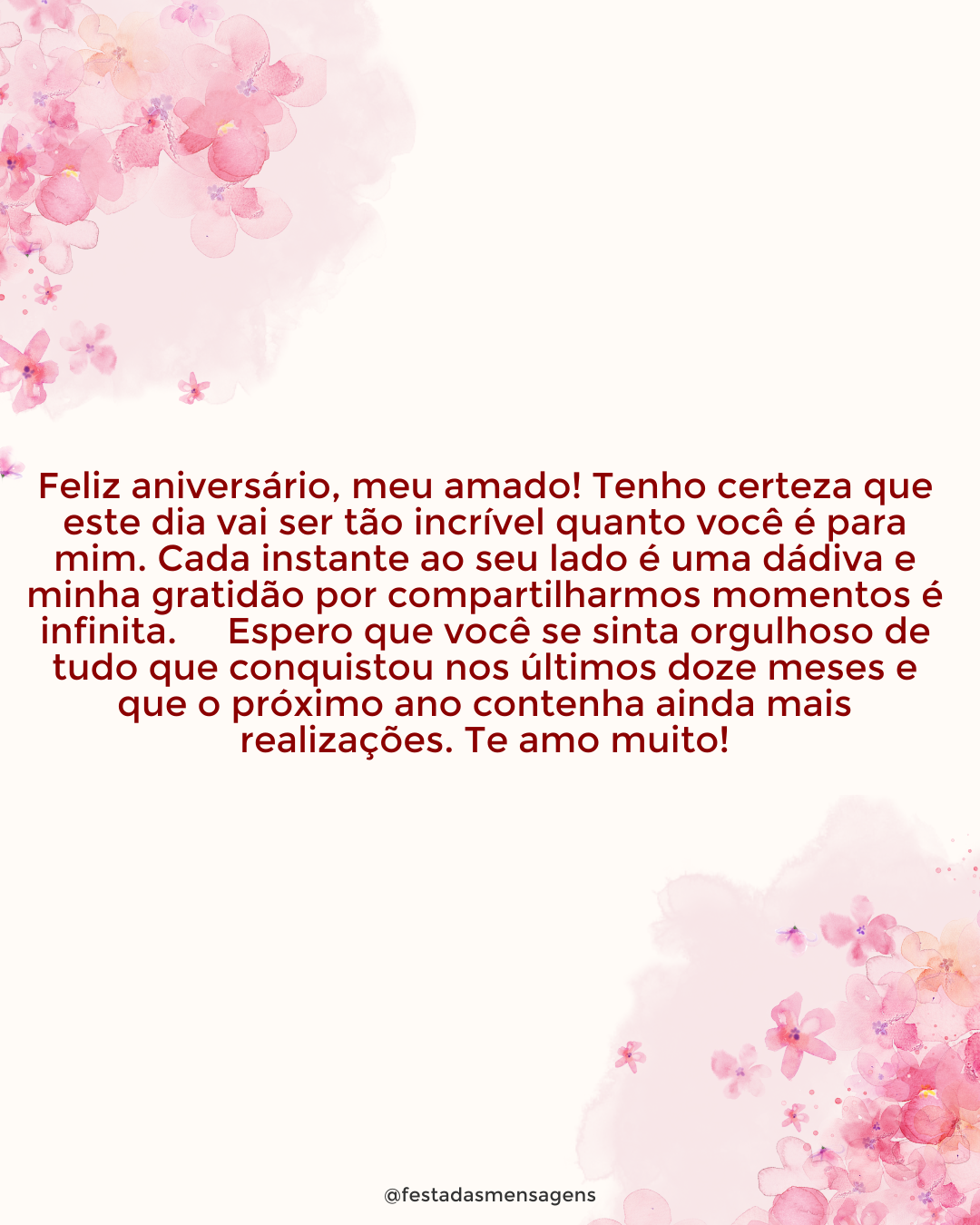 Hoje é seu grande dia e nada poderia me deixar mais feliz do que celebrar sua existência! Feliz aniversário! Você é simplesmente uma das melhores pessoas que algum dia tive a sorte de conhecer, seu coração é de ouro e tudo no seu olhar transparece generosidade... Que a felicidade seja seu par, não só hoje, mas sempre. Ah, e que seus sonhos se realizem e nunca lhe faltem motivos para acreditar na beleza da vida. Parabéns pelo seu dia! Você merece tudo de melhor.