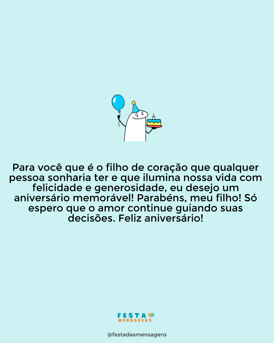 Feliz aniversário, meu filho! Vou contar um segredo para você. A adolescência pode ser uma fase confusa. Cheia de sentimentos e sensações novas. Tudo muda: o corpo muda, a voz muda e até a forma de pensar muda. Por vezes parece que estamos habitando um corpo estranho, que já nem parece o nosso. Mas sabe o que mais, tudo isso é passageiro e um dia volta tudo a normalizar. Por isso, curta muito a adolescência que é uma das melhores fases da vida.