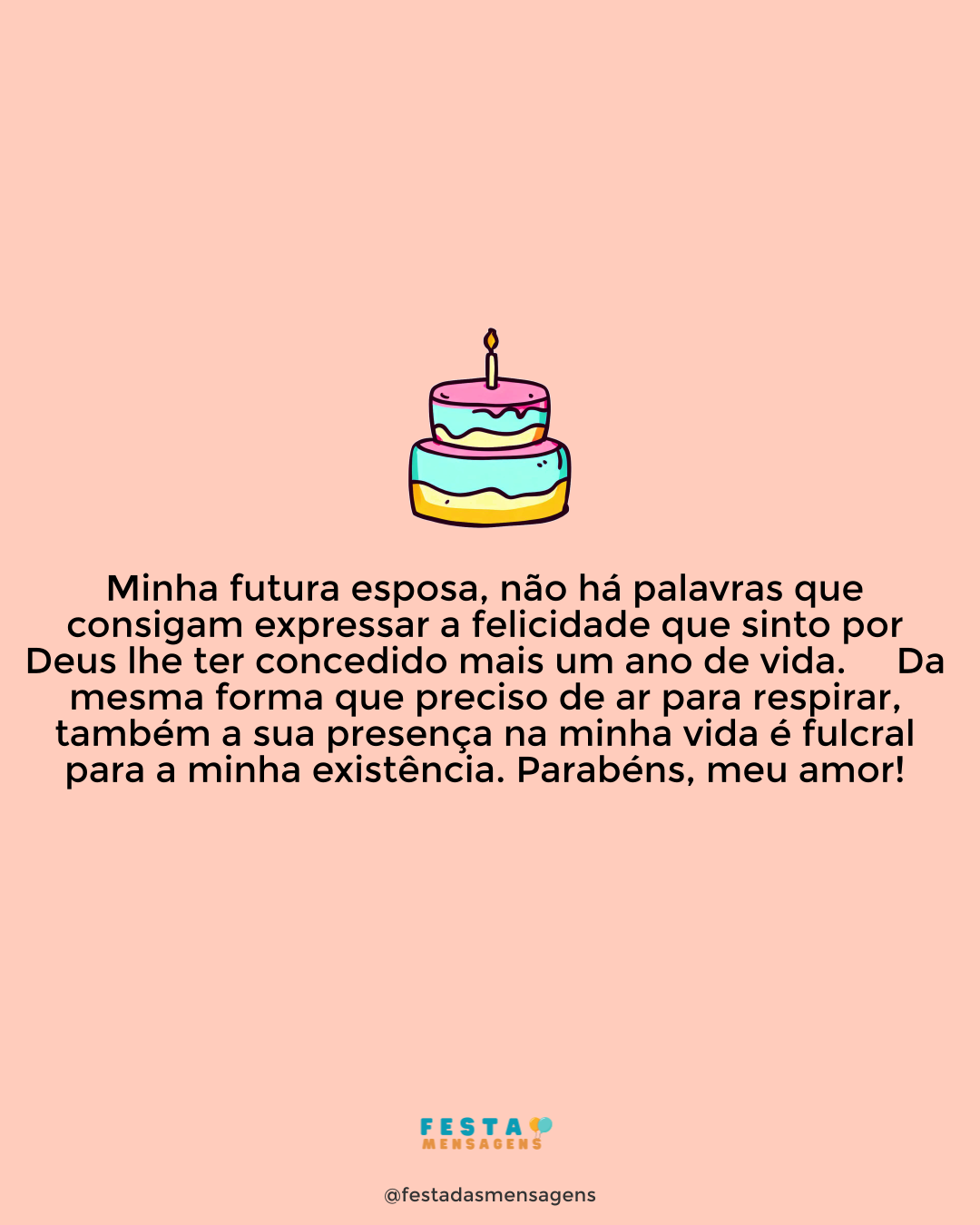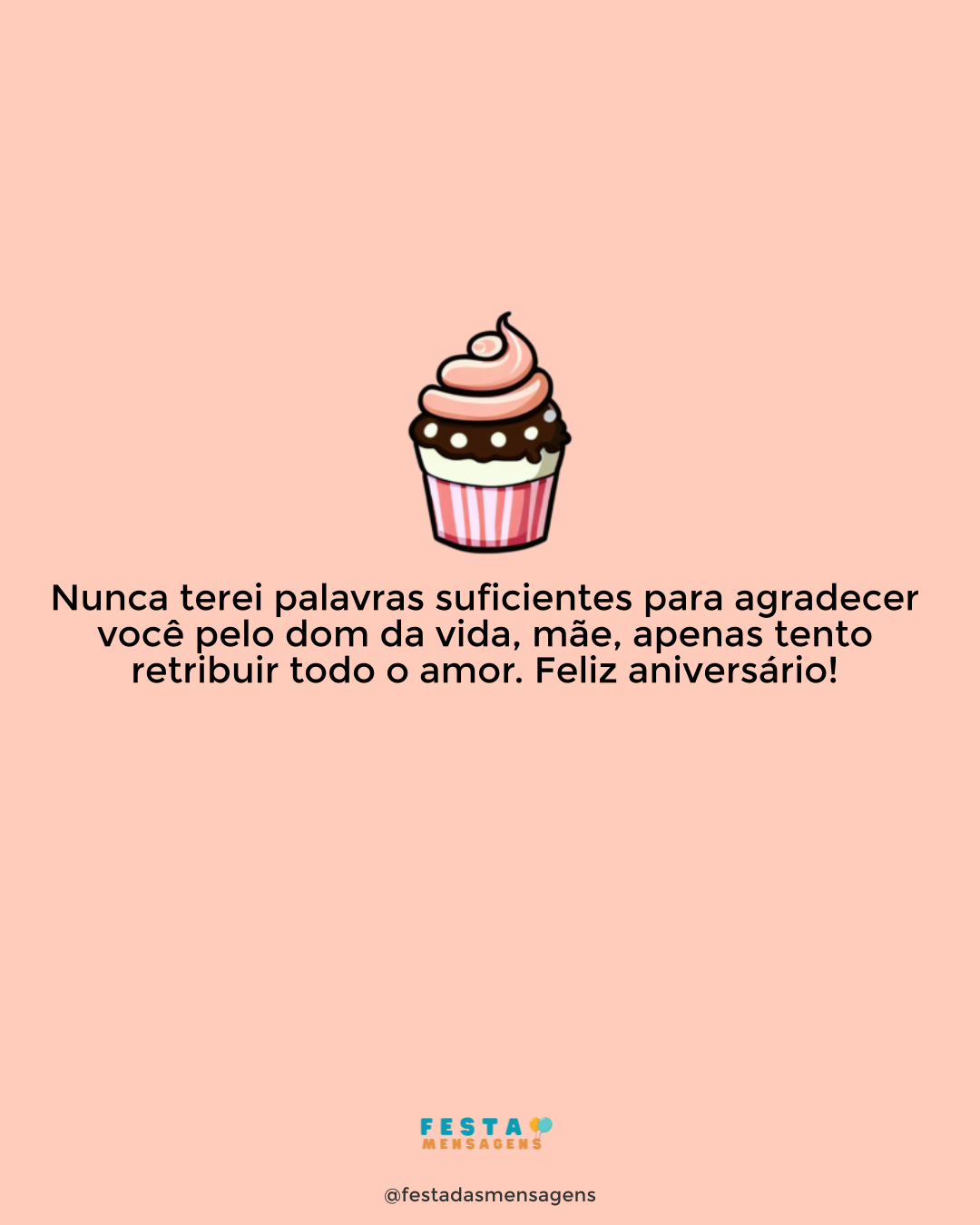 Dava tudo para estar com você – especialmente hoje, no dia do seu aniversário, minha mãe! Acontece que estamos distantes, longe do toque uma da outra. Sabe, mãe, você representa o melhor que existe em minha vida. Você me ensinou a crescer, a dizer “sim”, mas também a ter a coragem de dizer “não”. Você me ensinou a ser feliz. Sinto que a vida me ofereceu a melhor mãe de todas! Acredite que seria capaz de escalar a maior montanha do mundo só para dar um beijo em seu lindo rosto; e nadaria até ao infinito dos oceanos se você me pedisse. É que nosso amor incondicional é alimento para meus dias; representa a força que necessito para ultrapassar os obstáculos da vida, e é paz para caminhar na estrada que você me guiou desde sempre. Tenha um dia lindo, memorável! Eu te amo! Você é o amor da minha vida, querida mãe! Até breve.