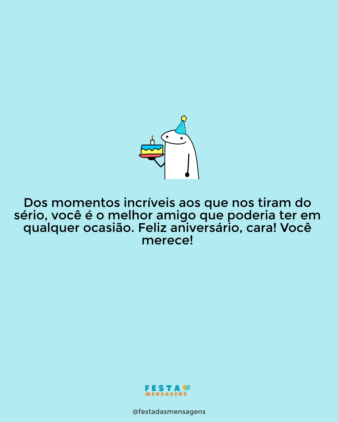 Parabéns, seu pentelho! Hoje você, o irmão mais mala do universo, faz anos e eu, que sou uma irmã bem chata, não poderia perder a oportunidade de importunar você! Você está ficando mais velho e isso já é visível, agora além de comportar como um idoso você também começa a parecer com um. Mano, brincadeiras à parte, você sabe que eu te adoro e faço qualquer coisa por você! Parabéns e seja muito feliz! Mil beijos.