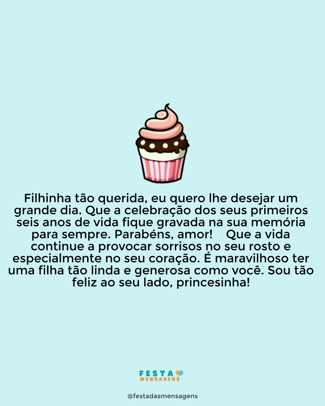 Meu amor, especialmente hoje o dia é seu. Tenha um aniversário muito feliz junto de todas as pessoas que estão ao seu lado desde sempre e assim continuarão. Parabéns pelos primeiros 3 anos de vida, filha! Você é a princesa do meu reino, o motivo certo para acordar feliz e a menina que mexe com meu coração. Todos os dias sinto felicidade, alegria, serenidade. Eu sei que a razão é sua existência. Te amo, querida! Prometo estar sempre perto para ajudar e apoiar você em todas as decisões da sua vida. Só assim me sinto bem, em paz. Você é tudo para mim, filha! Continue sorrindo, brincando e procurando a felicidade dia após dia. Feliz aniversário!