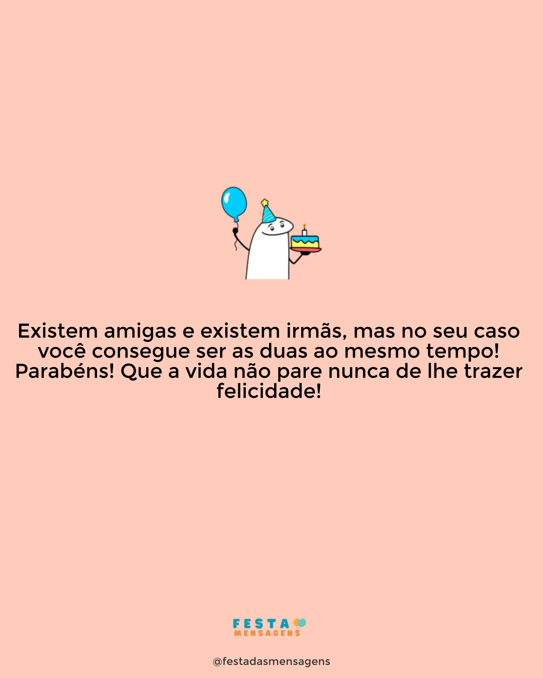 Feliz aniversário, minha irmã! Sei que você teve um ano de muitas reviravoltas e precisou ser uma guerreira para muitas dificuldades, mas graças a sua força de vontade você superou tudo. Tenha um aniversário maravilhoso e que este seja um ano de muita tranquilidade, felicidade de início de uma nova fase na sua vida. Você merece todas as suas vitórias. Parabéns!