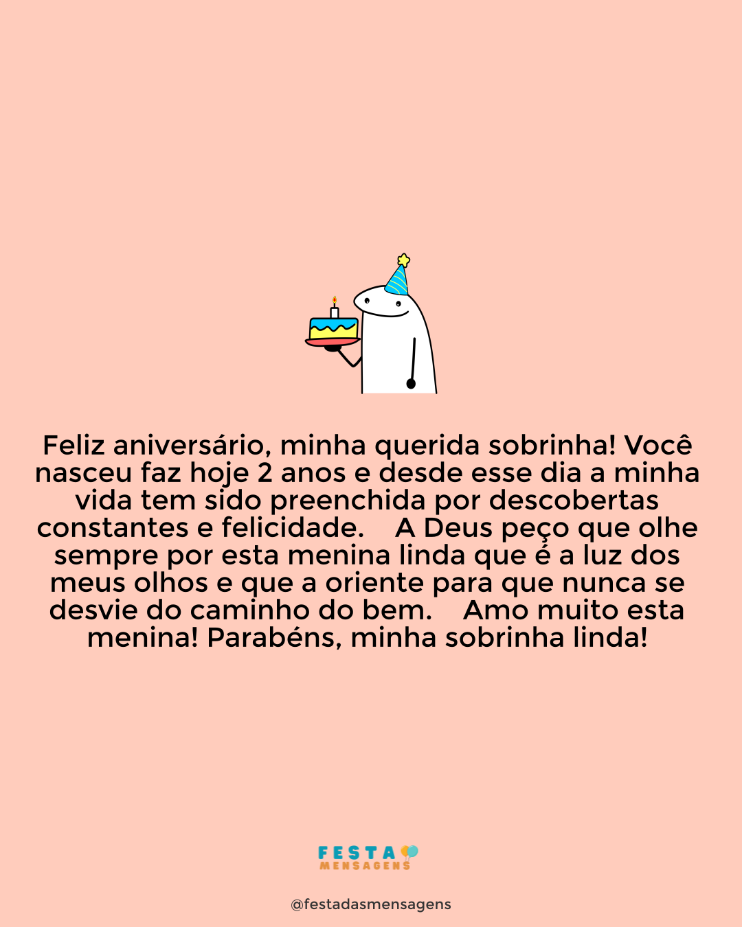 Minha sobrinha pequena e amada, hoje o dia é todo seu e eu mal posso esperar para poder abraçá-la forte e desejar um feliz aniversário. Você é uma dádiva na vida desta família e todos nós nos sentimos abençoados por tê-la presente nas nossas vidas. Que seu dia seja repleto de luz, de encantos, de alegrias e que seu novo ano seja muito especial. Você é um anjinho que caiu do céu para alegrar meus dias e eu tenho muito orgulho de tê-la como minha sobrinha. Felicidades, minha linda!