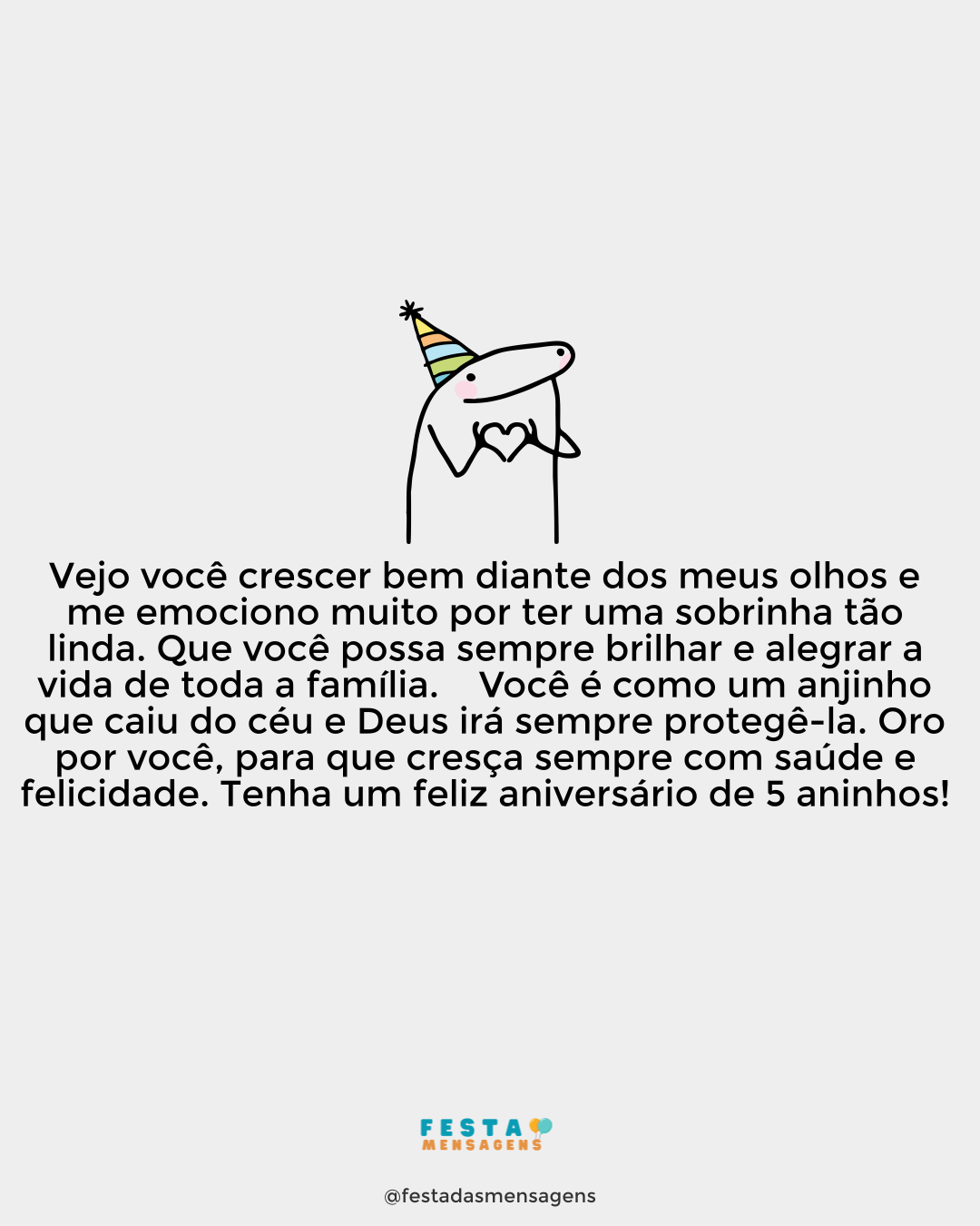 Parabéns minha princesinha! A titia lhe deseja tudo do bom e do melhor para você, e que seja muito feliz no futuro. Que Papai do Céu lhe abençoe cada dia mais e que você tenha muita saúde e paz na vida. Minha princesinha está crescendo e está ficando mocinha! Eu a amo demais, ninguém pode explicar esse amor que eu sinto por você, ele é inexplicável. Tudo que eu sinto por você é verdadeiro, eu nasci para a amar e você nasceu para abençoar todos os que a conhecem. Eu te amo, princesa linda! Feliz aniversário!