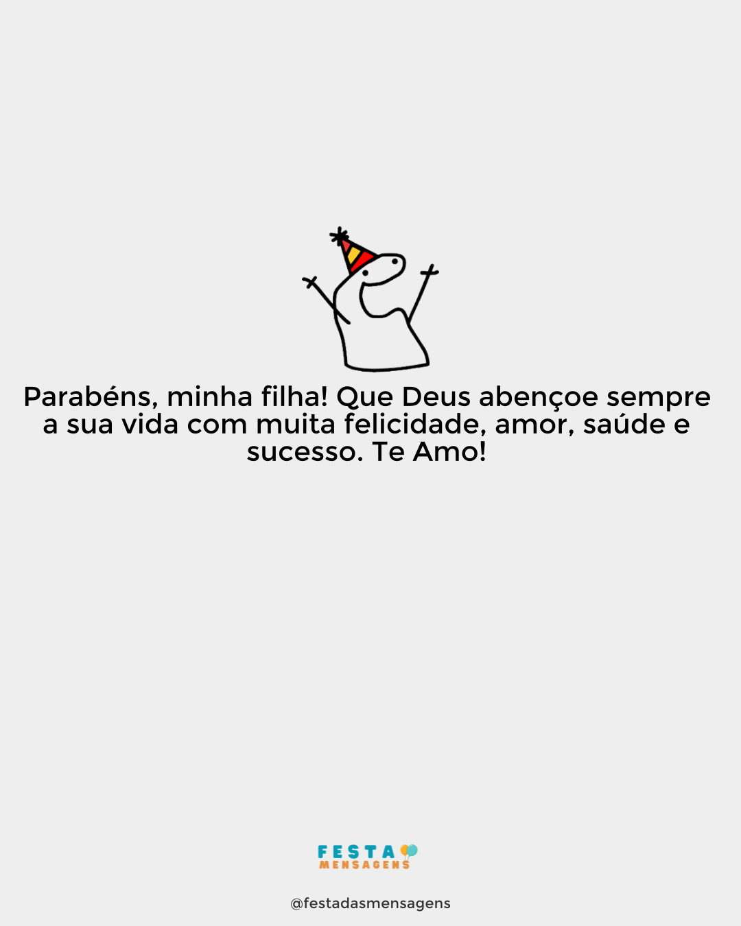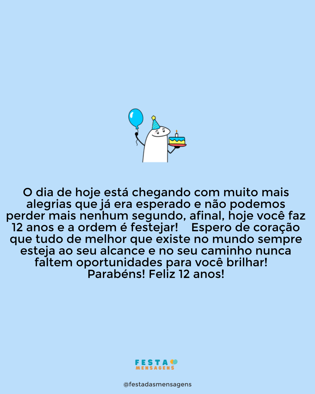 Feliz 12 anos de vida, filha! Parabéns por completar mais um ano com tantos motivos para comemorar! Hoje é um dia incomparável, pois nenhum outro consegue reunir tanta alegria e diversão em um só festa! Aproveite muito! Milhões de beijos e abraços para você! Te amo!