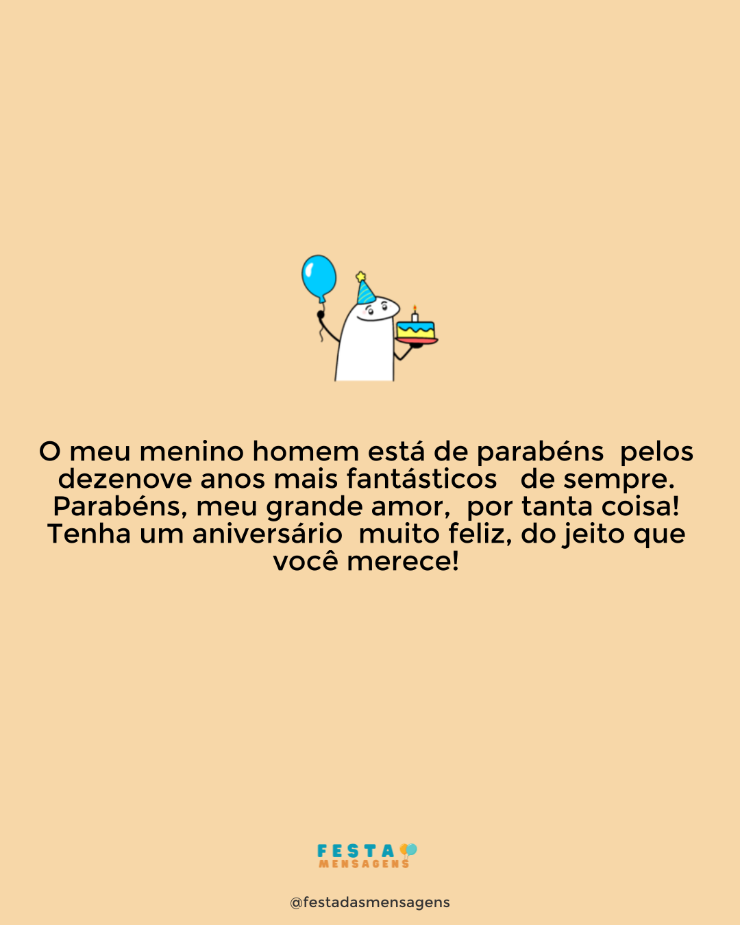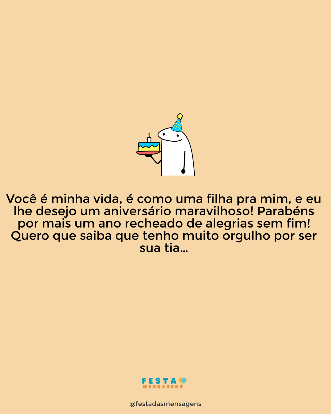 A vida me ofereceu a melhor coisa que poderia algum dia pedir: o seu amor, filha. Foi exatamente há dezenove anos que você nasceu, querida. Feliz aniversário! Saiba que a adoro profundamente, com todas as minhas forças, com todo meu coração. O dia do seu nascimento foi mágico e revelador para mim, porque descobri a sincera e infinita felicidade. Eu estarei ao seu lado todos os dias, meu bem. Aconteça o que acontecer, eu nunca estarei distante demais. Curta esta data junto de quem mais ama, faça o que quiser, respire fundo e prepare-se para uma grande festa. Parabéns por mais um ano, princesa! Mil e dezenove beijos.