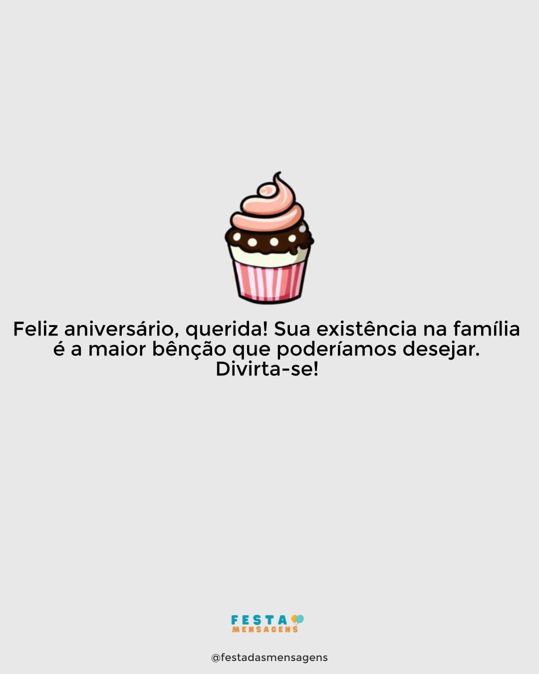 Estamos distantes e longe uma da outra, mas nunca me senti separada de você. E especialmente hoje estamos ligadas de alguma forma com toda certeza. Tenha um aniversário maravilhoso, querida prima! Que não faltem razões para ser feliz e motivos para se sentir realizada. Desejo que a alegria de hoje permaneça para todos os dias da sua vida. E que um dia estejamos juntas e perto uma da outra para sempre. Parabéns, prima! Eu gosto muito de você.