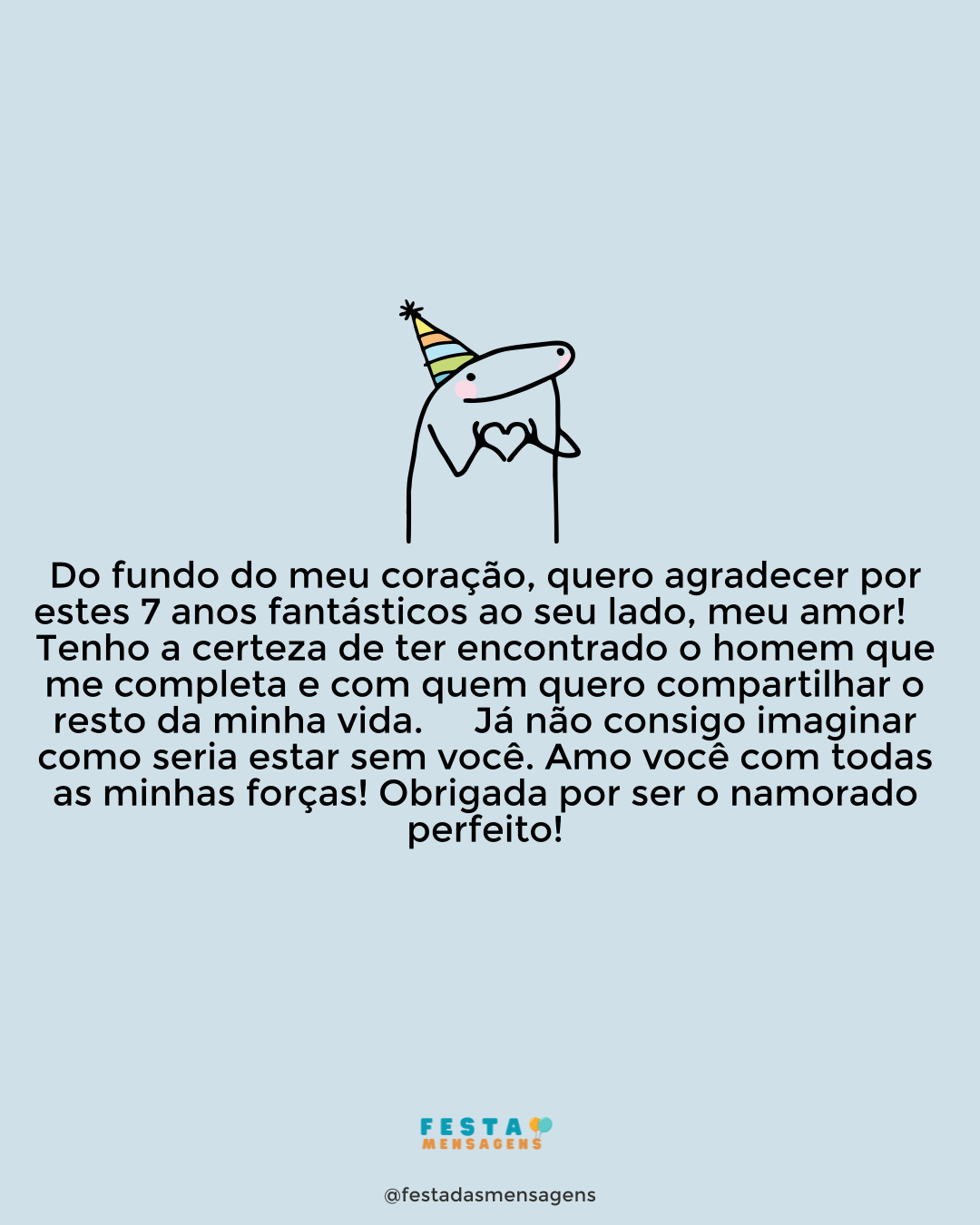 Do aniversário do meu amor eu quero ser a primeira a lembrar, por isso mesmo antes do tempo eu vou já dizendo: parabéns, meu amor! Não posso esperar, pois quero desde já lembrar quanto amo você e como é maravilhoso ser a sua namorada. Você é um homem de sonho, o melhor namorado e o meu melhor amigo. Quando chegar o dia quero apenas que os meus desejos se cumpram, e assim você terá um dia perfeito e muito alegre. E na vida nunca lhe faltará felicidade, amor, saúde e sucesso. Te amo!
