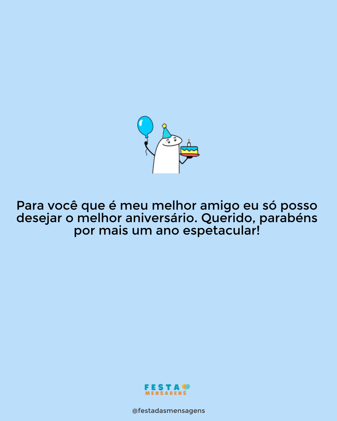 Hoje é mais um dia de festa. É o dia que celebramos o teu aniversário. E nesse dia festivo te cercamos de abraços e felicitações! Você é uma pessoa muito querida, e por isso todos os teus amigos e parentes te desejam tudo de bom. E eu, presenteio você com essa singela homenagem. Singela, mas repleta de todo o meu carinho. Parabéns para você, vizinho!