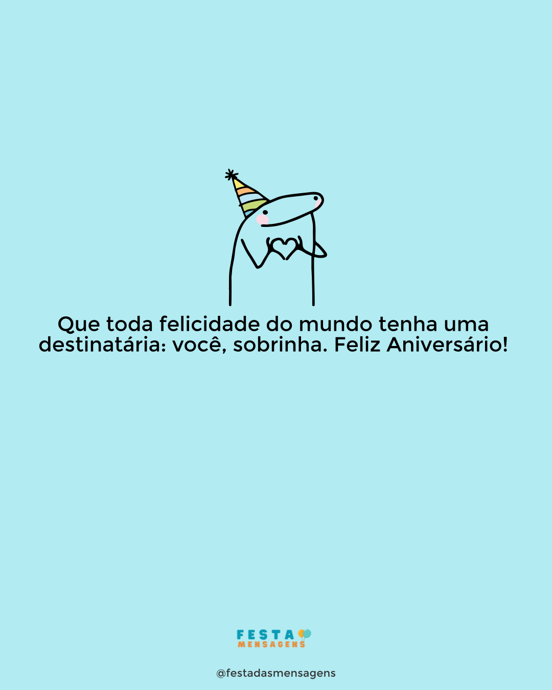 Hoje para você será um dia de festa, surpresas, doces gostosos e muitos presentes. Mas para todos que amamos você o dia tem muito mais significado, pois comemoramos a data em que você veio encantar nossas vidas de alegria e amor. Feliz aniversário, meu amado sobrinho! Espero que se divirta muito hoje, e que seu coraçãozinho se aqueça com todo amor e carinho que receber. E que a vida lhe sorria e nela sempre encontre o caminho da felicidade.