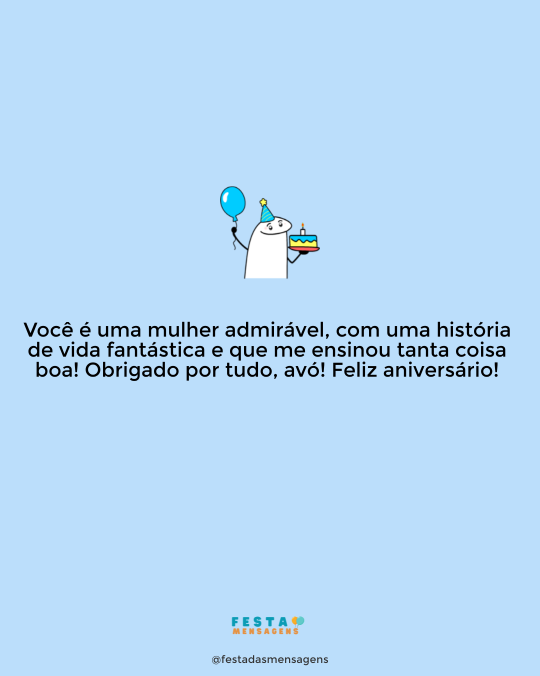 A minha bisavó é simplesmente a pessoa mais querida e fofa que algum dia conheci. Tenho muita sorte em ter ao meu lado a minha bisavozinha! Feliz aniversário, querida! Desejo muita festa, energia positiva e alegria neste seu dia e também em toda sua vida. Você é um ser humano especial e dono de uma forma admirável de enxergar o mundo. É um privilégio compartilhar meu sangue e também meu dia a dia com uma pessoa tão sábia e generosa. Sabe, bisavó, você é uma inspiração para mim e para tudo que anseio ser. E é por isso que tudo farei para lhe oferecer o melhor dia possível junto de quem você mais ama. Prepare-se porque vem aí uma jornada que jamais será esquecida. Parabéns!