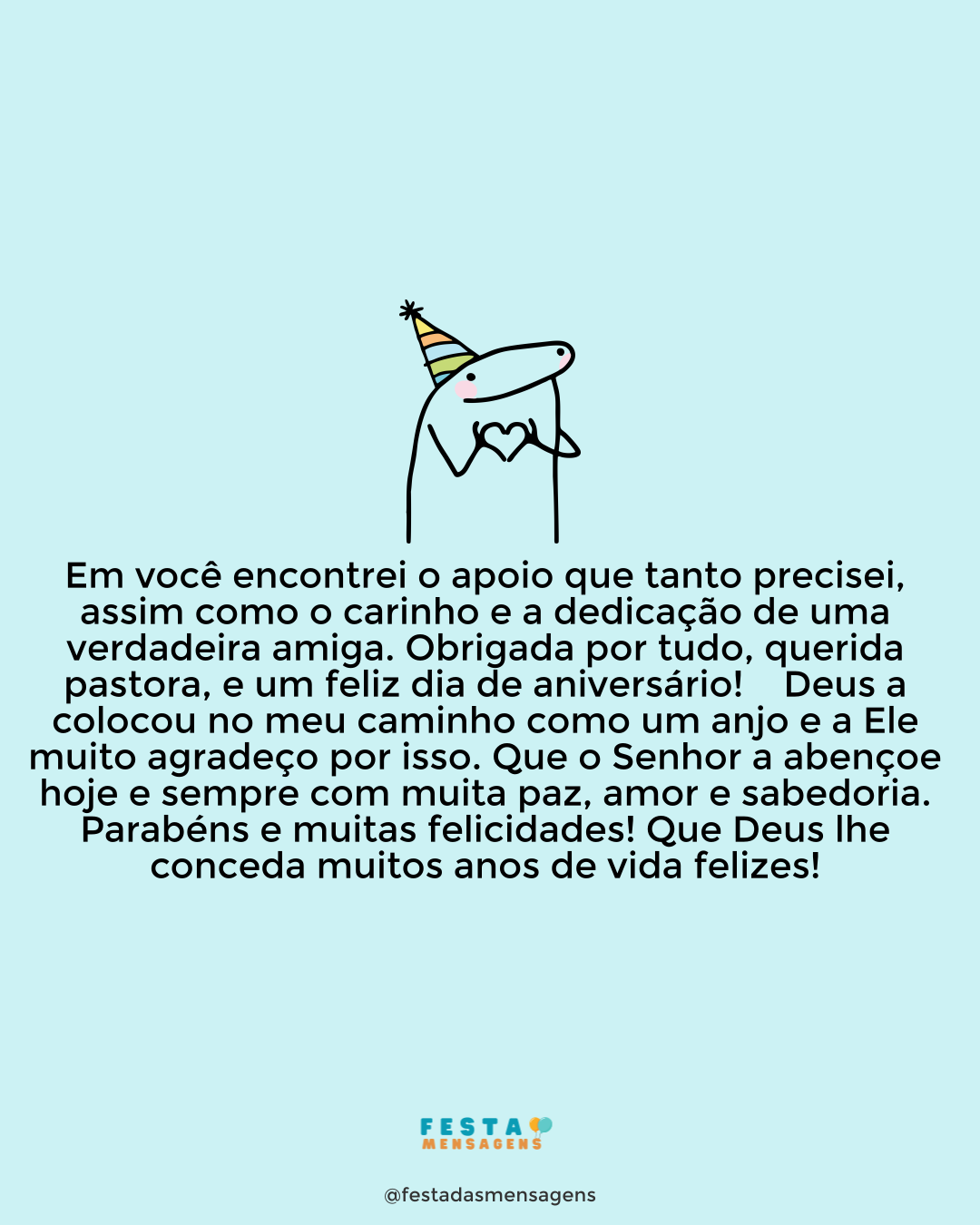 Pastor, muito me alegra fazer parte de uma comunidade que tem à frente alguém tão especial como você, motivo de orgulho para todos nós. Espero, de todo coração, que tenha muitas alegrias ao longo da sua caminhada. E que Deus lhe dê sempre muita força e coragem para dar continuidade ao projeto de vida que Ele colocou nas suas mãos. Gostaria de agradecer por todas as vezes que você me acolheu com palavras simples e sábias que me deram força para ultrapassar as dificuldades do dia a dia. Gostaria também de agradecer por todas as alegrias que eu tenho desde que fui acolhida nesta igreja, que já é a minha segunda casa, graças a você. Parabéns e votos de muitas felicidades, hoje e sempre! Com amizade.