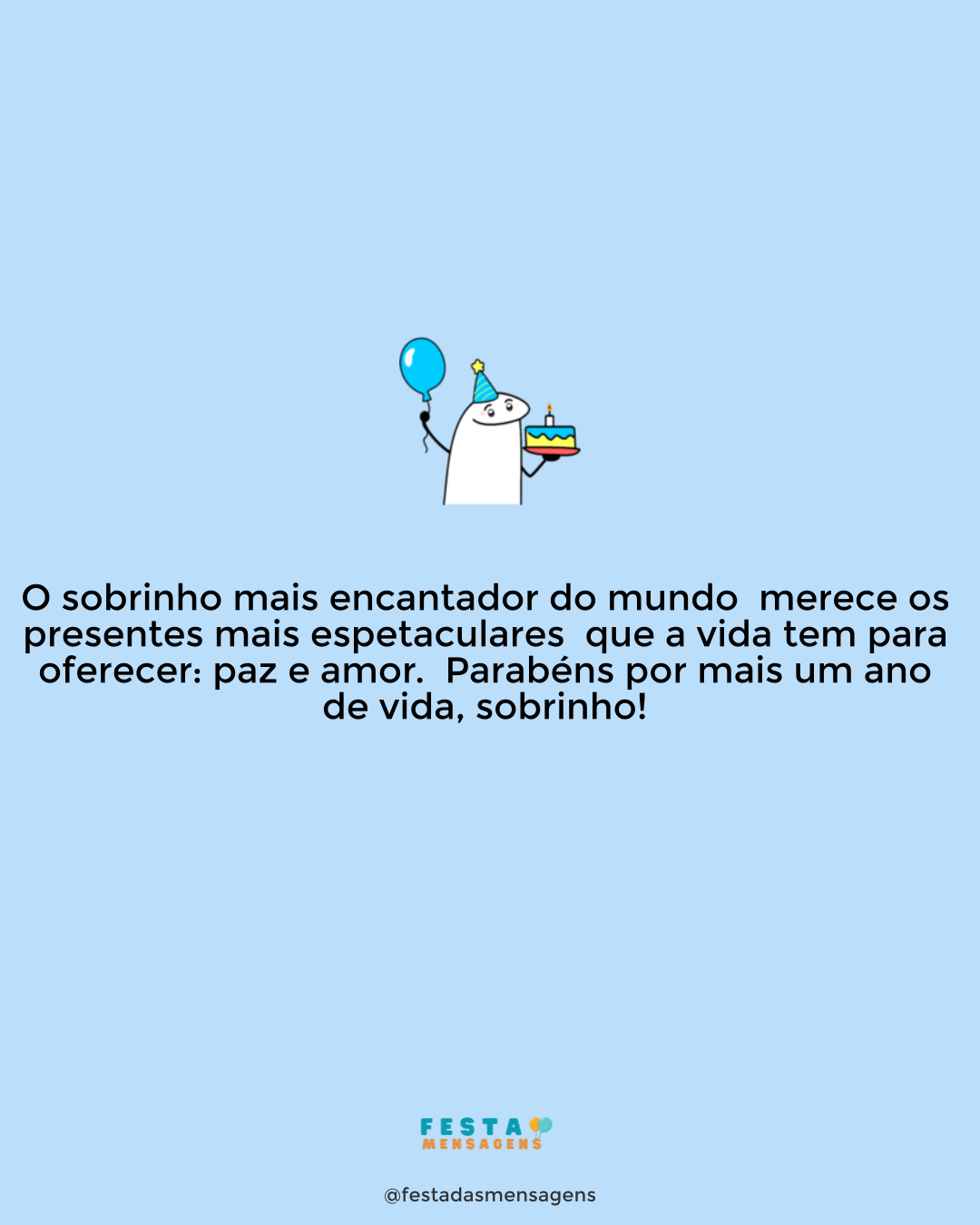 O meu desejo no seu dia especial é que tenha um dia de aniversário abençoado, querido sobrinho! Completa hoje 2 anos de vida e espero que Deus nunca saia do seu lado e o acompanhe sempre ao longo de toda a sua vida. A titia ama você demais e quer apenas que você seja muito feliz e que tenha muita saúde e amor na sua vida. Muitas felicidades e que Nosso Senhor lhe dê muitas bênçãos!
