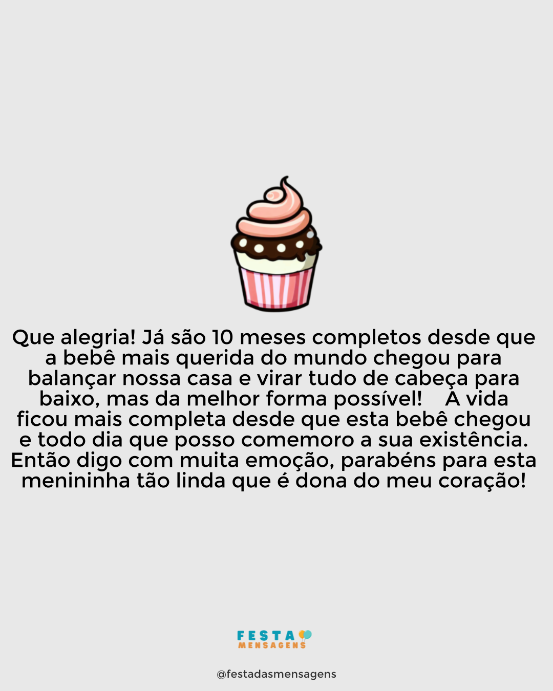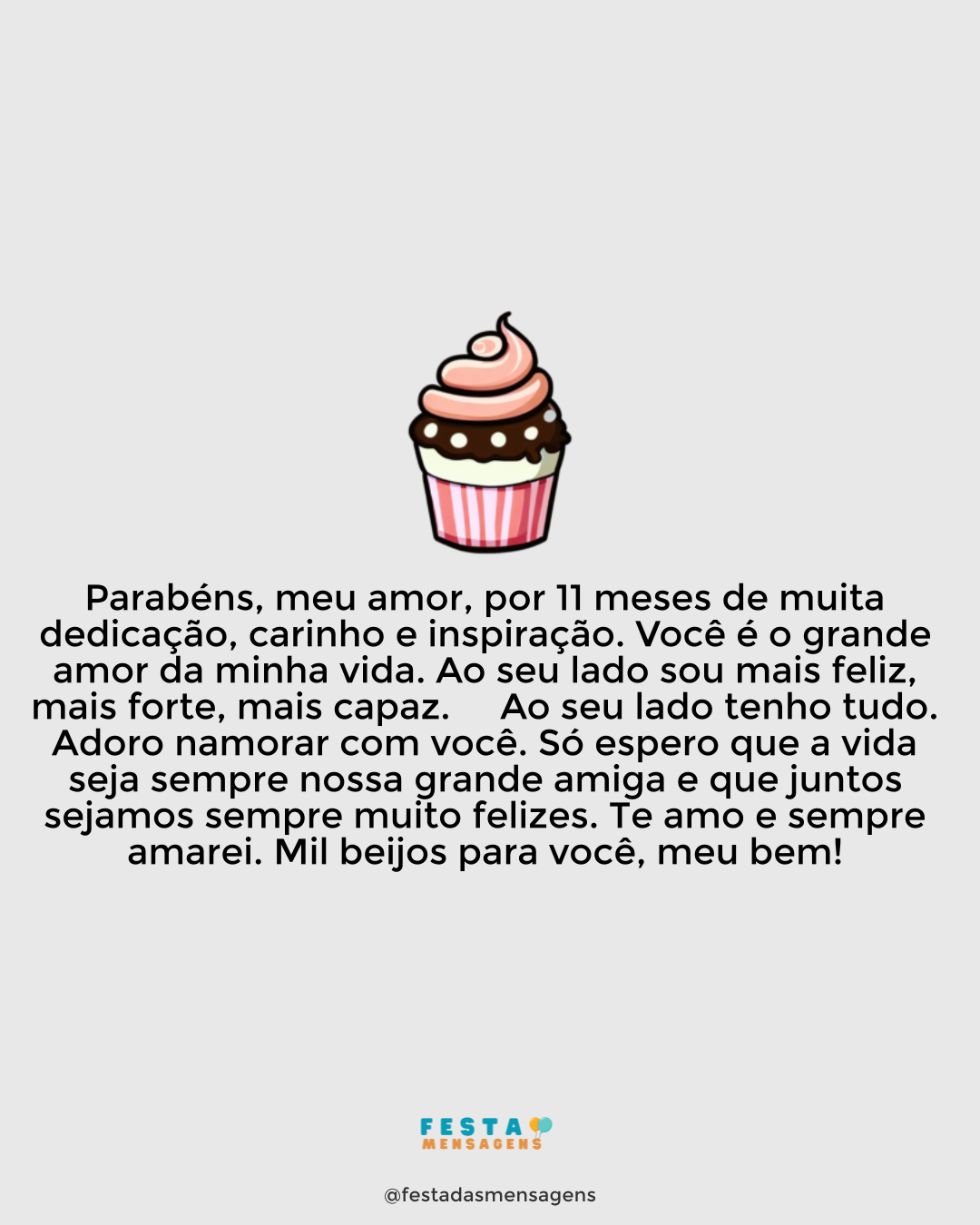 Filhinha querida, minha menina, meu amor, hoje você completa os primeiros onze anos de existência neste mundo fascinante. Que a vida continue a sorrir na sua direção e nunca lhe falte alegria ao coração. Parabéns! Continue a encontrar beleza em todas as coisas, a se divertir com tudo e com nada. Por favor, nunca deixe de fazer o que lhe faz feliz e de correr atrás do que tanto deseja. Quero ver você de bem com a vida sempre, por isso conte comigo para tudo. Eu nunca estarei longe demais. Na verdade, o meu lugar, a minha casa é onde você estiver e por essa razão estaremos sempre em união. Aproveite esta data com um sorriso de orelha a orelha. Você é uma menina incrível e merece tudo de bom da vida. Feliz aniversário, filha!