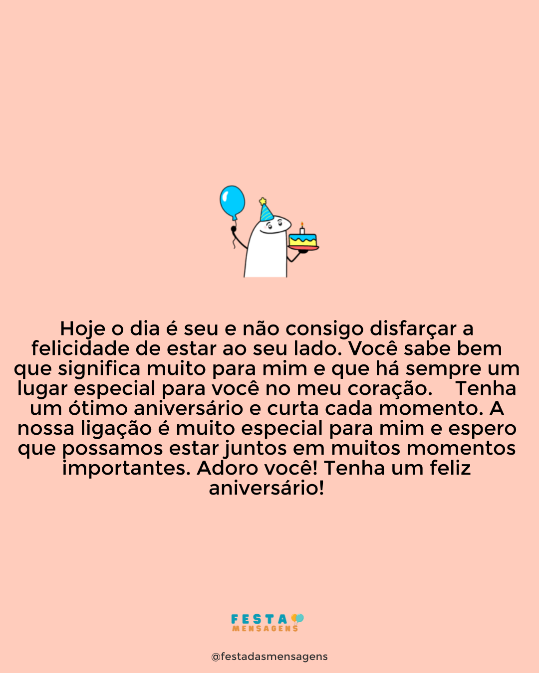 Hoje ninguém vai parar você, titia! É seu aniversário, sua grande festa! Por favor, siga o conselho da sua sobrinha: aproveite muito esta data para fazer tudo aquilo que quiser. Com toda certeza você tem sonhos por realizar, corra atrás de todos eles para se sentir mais feliz. Faça isso hoje! Agora! Não tema o fracasso, mas sim o tempo que corre a uma velocidade astronómica. Tenho muito orgulho na tia querida e fofa que a vida me ofereceu. É por isso que torço pelo seu sucesso todos os dias e todas as noites. Você é como uma segunda mãe para mim. Seja feliz! Parabéns por mais um ano de vida!