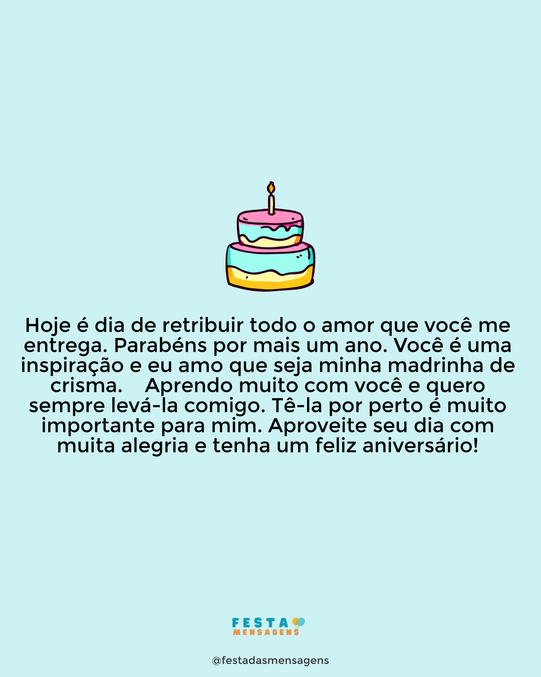 Sinto um orgulho enorme de tê-la como aluna e espero que neste dia especial possa desfrutar de toda alegria que merece. Aproveite muito esta nova fase da sua vida. Continue sendo esta menina tão querida, educada e amiga de todos. Tenho certeza que um futuro brilhante está esperando por você. Aproveite o seu aniversário! Parabéns!