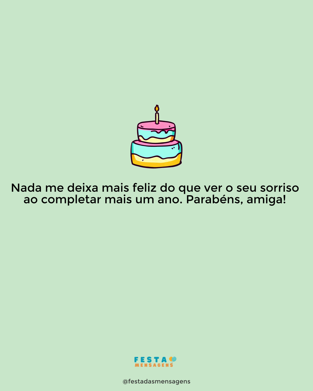 Hoje a distância e a saudade ficarão de lado, pois só há espaço para muita alegria e os melhores votos de felicidade! Quero que os sorrisos no seu rosto se multipliquem durante todo o dia e que a diversão possa tomar o meu lugar e virar sua melhor amiga hoje. Espero que a sua coragem seja renovada e lhe proporcione ainda mais caminhos para encontrar a sua felicidade. Torço também para que o tempo acelere o nosso próximo encontro, pois não é fácil ter uma amiga maravilhosa como você assim tão longe. Que você tenha sempre muita paz, saúde e sonhos realizados! Às vezes me pergunto por que a vida nos deixou tão longe… Até que percebi que as justificativas são inúteis já que tenho o mais importante: a sua amizade! Parabéns, minha amiga!