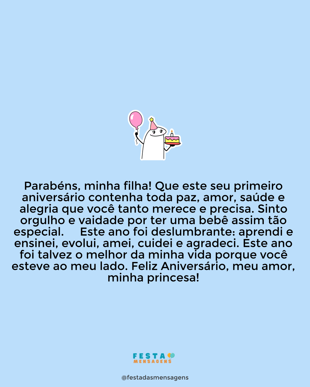 Como seu pai, todos os dias são dias de celebrar a filha maravilhosa que tenho e que tantas alegrias me deu ao longo dos seus 15 anos de vida, mas Deus escolheu este dia para trazer você a este mundo e, por esse motivo, hoje celebro com mais intensidade a sua vida. O seu lindo coração de ouro merece toda a felicidade que nele couber e mais alguma ainda. Nunca deixe de sonhar e procure em cada ocasião realizar os seus sonhos, só assim encontrará a verdadeira felicidade. Eu encontrei a minha há 15 anos. Feliz aniversário, querida filha!