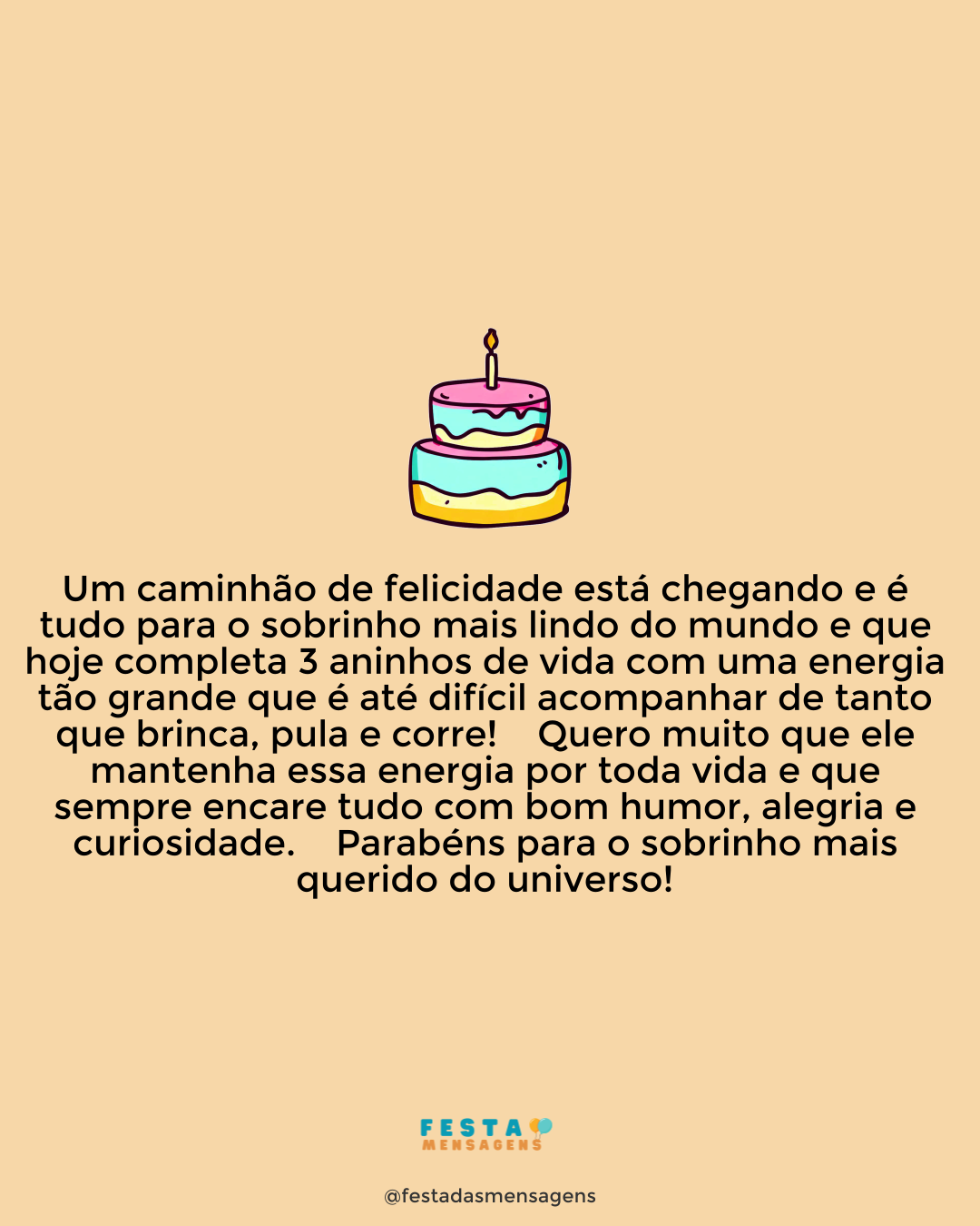 Fico tão feliz por ver você crescer e atravessar as diferentes fases da vida! Parabéns, meu filho! A adolescência é o melhor de dois mundos: ainda pode continuar a brincar como as crianças, mas já vai tendo algumas das liberdades dos adultos. Aproveite esta nova etapa para explorar o mundo e para descobrir o que ele tem para lhe oferecer. A aventura da vida ainda mal começou para você, por isso, curta esta fase em que se encontra, os melhores momentos da vida você estará prestes a vivê-los. Não se preocupe com o amanhã e curta a vida! Beijo enorme do papai!