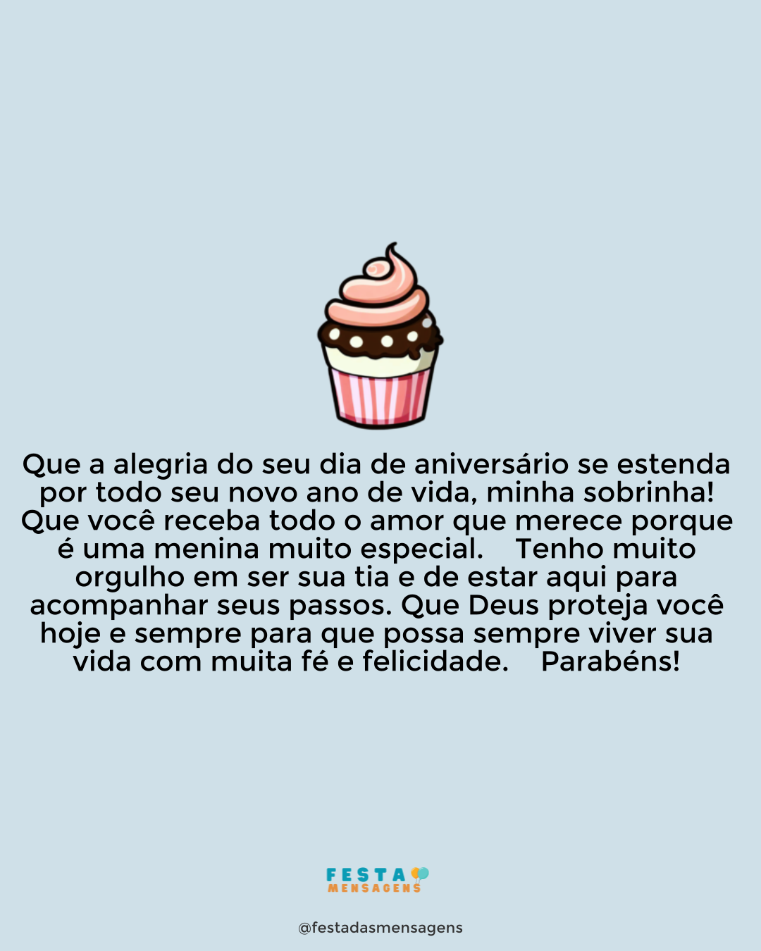 Parabéns, sobrinha querida! Desde sempre tenho uma forte admiração por você. Lembro perfeitamente dos seus primeiros passos, das suas primeiras palavras. Lembro de todas as fases do seu crescimento até hoje que você é uma linda adolescente. Essas recordações enchem meu coração de tia, porque seu jeito sempre foi muito doce, muito carinhoso comigo. Desejo que seu dia contenha toda a paz e a alegria que você merece. Mil e um beijos, meu bem!