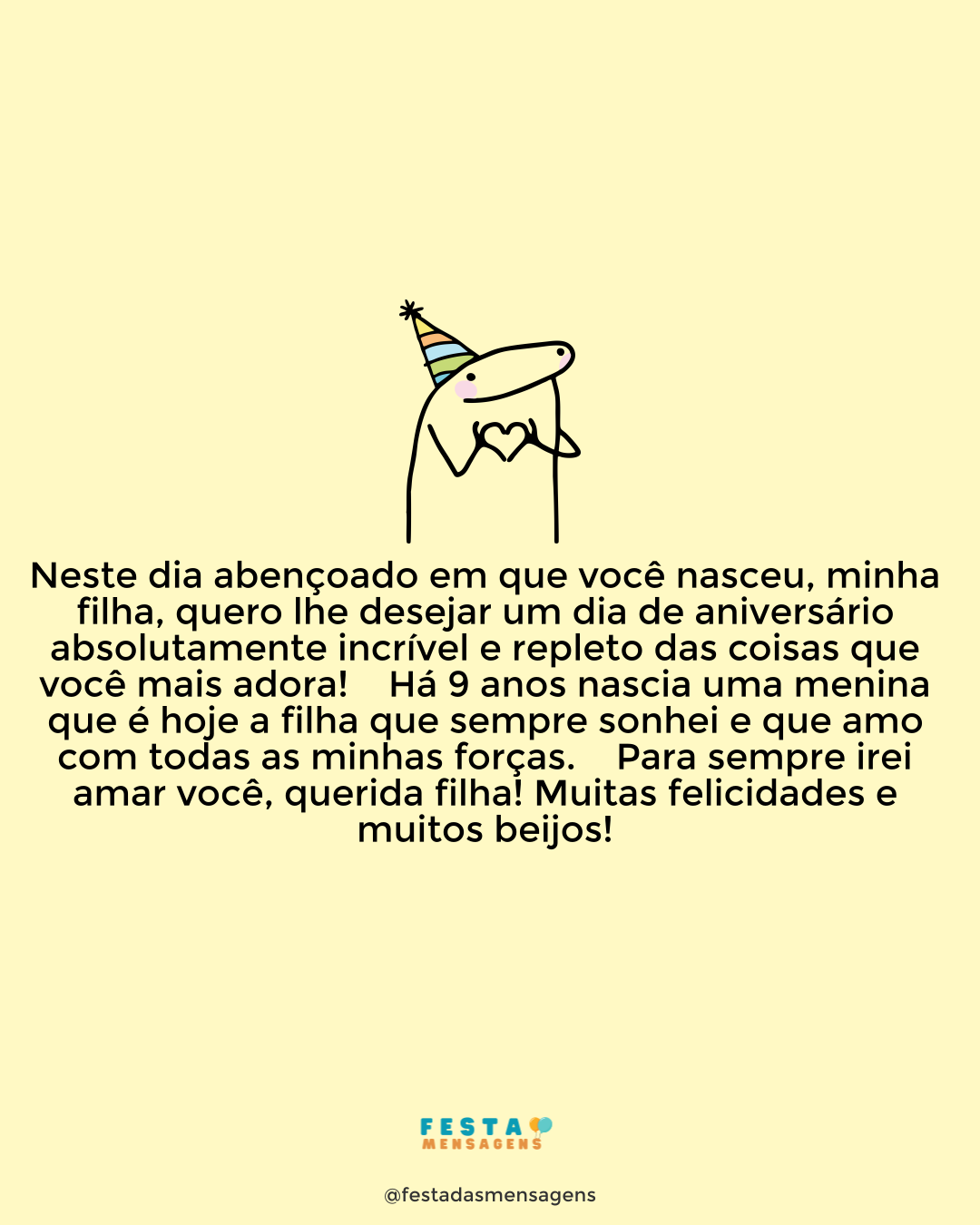 Parabéns por completar 12 anos de vida! Acho que hoje você entra oficialmente na adolescência. Começam agora mesmo a surgir as primeiras e grandes dúvidas, as certezas, as ilusões, os amores e amizades para toda vida. Aproveite esta etapa com confiança e ambição de curtir todos os momentos; de fazer com que todos os instantes perpetuem na sua memória. Viver a sério é viver com intensidade, por isso viva de verdade. Reúna seus amigos e amigas, os familiares que mais gosta, as pessoas que mais ama. Faça uma grande festa, orgulhe-se do que já construiu e preserve com serenidade os sonhos que tem para realizar. Feliz aniversário!
