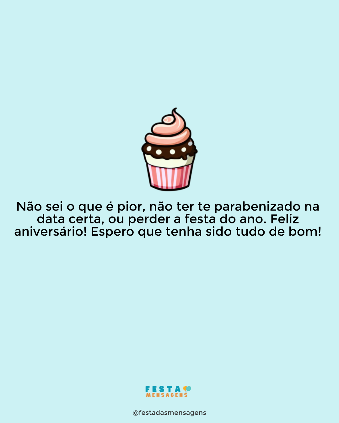 Um amigo é um companheiro para toda vida; é alguém que se ama e se cuida de alma e coração. Você completou mais um ano de vida e eu não lhe dei meus votos de aniversário feliz. Aceite meus parabéns atrasados, amigo, e desculpe pela minha distração. Você sabe que não é por mal. Eu simplesmente me esqueço de tudo, inclusive das datas das pessoas que são importantes para mim, tal como você é. Agora só posso lhe desejar um ano muito especial e prometer que meu esquecimento se transformará em lembrança no próximo ano. Um abraço forte, amigo. Feliz aniversário!