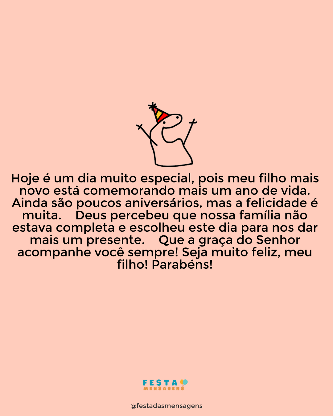 Feliz aniversário, querido! Você é filho de uma grande amiga e espero que seu dia seja de muita alegria e seu ano de saúde e sucesso. Aproveite muito e prepare-se para ter uma grande festa, repleta de amigos e muita diversão! Parabéns, querido! Feliz aniversário!
