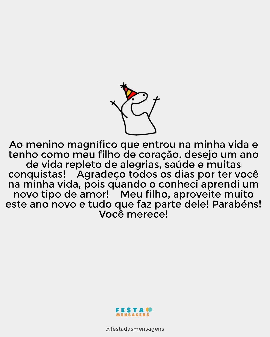 Feliz aniversário, querido! Você é filho de uma grande amiga e espero que seu dia seja de muita alegria e seu ano de saúde e sucesso. Aproveite muito e prepare-se para ter uma grande festa, repleta de amigos e muita diversão! Parabéns, querido! Feliz aniversário!