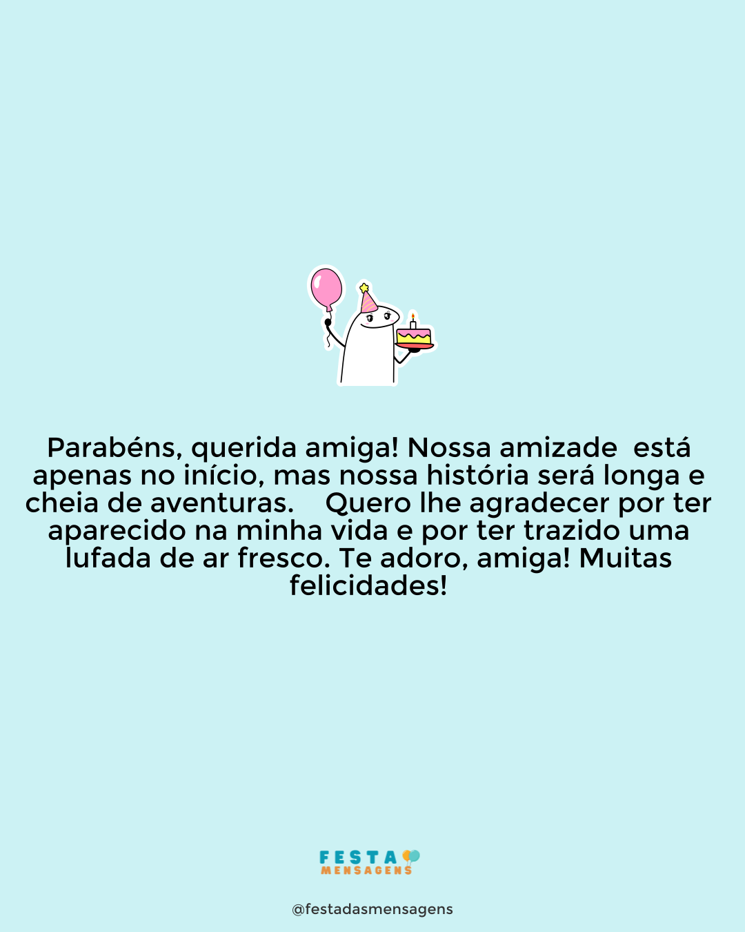 Com você, eu aprendi que a amizade é uma coisa maravilhosa, mesmo se for vivida à distância, de forma quase virtual. Querida, parabéns por completar mais um ano de vida. Feliz aniversário! Eu gosto muito de você e sinto que temos inúmeras coisas em comum. Temos construído um relacionamento baseado no respeito e no carinho, e eu confesso que jamais acharia que fosse possível criar algo tão forte sem nunca termos nos encontrado. A verdade é que sim, é possível! Você é minha grande amiga, uma pessoa incrível que tive o privilégio de conhecer e tenho sorte por ter. Saiba que a adoro do fundo do meu coração e torço para que seu dia seja simplesmente brilhante! Parabéns!