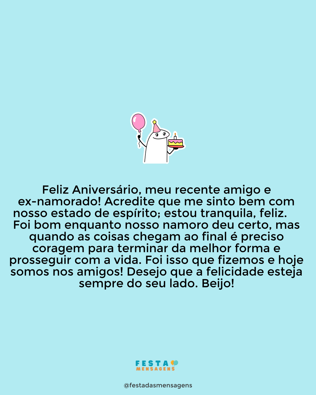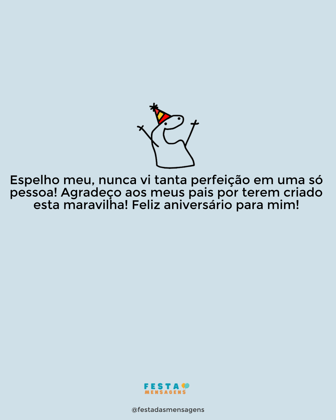 Parabéns! E boas-vindas para alegria e paz e amor e felicidade e risada e boa energia e que não falte a gargalhada neste dia tão especial para você! Divirta-se e celebre em grande estilo a dádiva da existência. Felicitações!