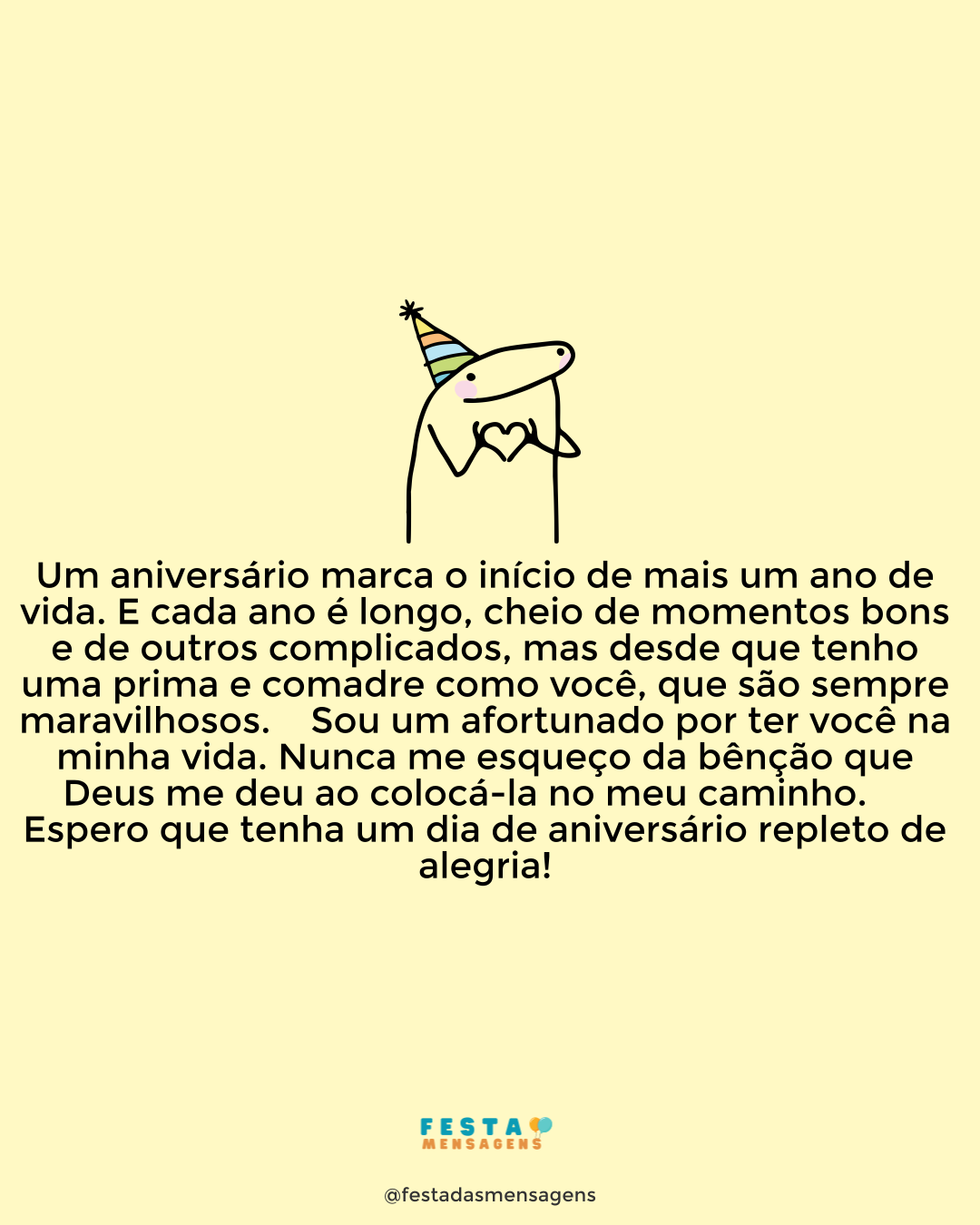 Que dia tão feliz! Você está de parabéns por completar mais um ano de provações, vitórias e conquistas sem fim. Querida cunhada e comadre, eu lhe desejo uma jornada muito especial! Você merece tudo que existe de bom neste mundo. É que mais do que família você é parte de quem sou; uma amiga de verdade. Temos uma ligação que ultrapassa quaisquer coisas nesta vida. E é por isso que hoje e sempre eu lhe desejo muita alegria, paz e harmonia com tudo e todos. Divirta-se junto das pessoas que ama e comemore sua existência com uma grande e memorável festa de aniversário. Parabéns!