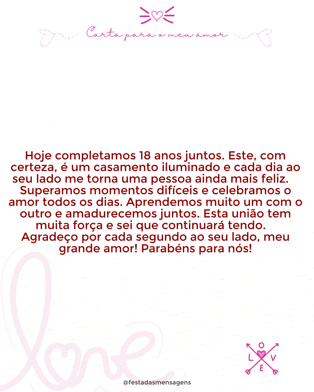 A cada dia que passa eu tenho certeza que você é minha alma gêmea. Que nasci para ser amada por você! Que nasci para amar seu nome, seu rosto, seu coração. Sou feliz, porque você é meu marido; porque compartilhamos tudo; porque é fácil confiar na sua palavra. Sou feliz, porque adoro o conforto do seu abraço e porque sou a pessoa mais realizada que existe. Amo você até ao infinito do tempo!