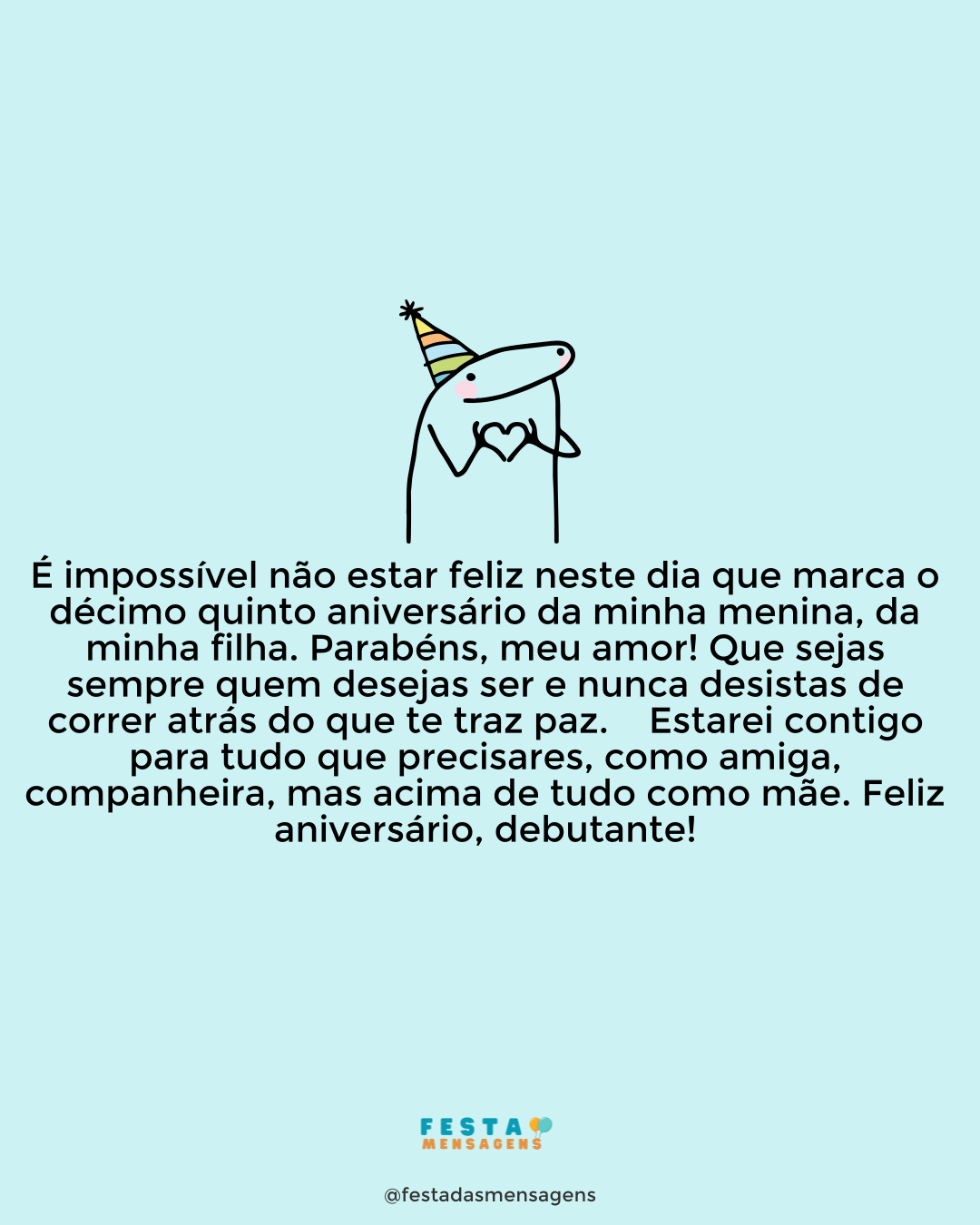 Hoje, você celebra 15 anos de vida, minha princesa, e eu não poderia estar mais orgulhosa da pessoa maravilhosa que você se tornou. Agora, meu desejo de mãe é que sua nova fase seja cheia de aventuras, provações e conquistas. Você é meu maior tesouro e sempre será, aconteça o que acontecer. Parabéns, minha filha!