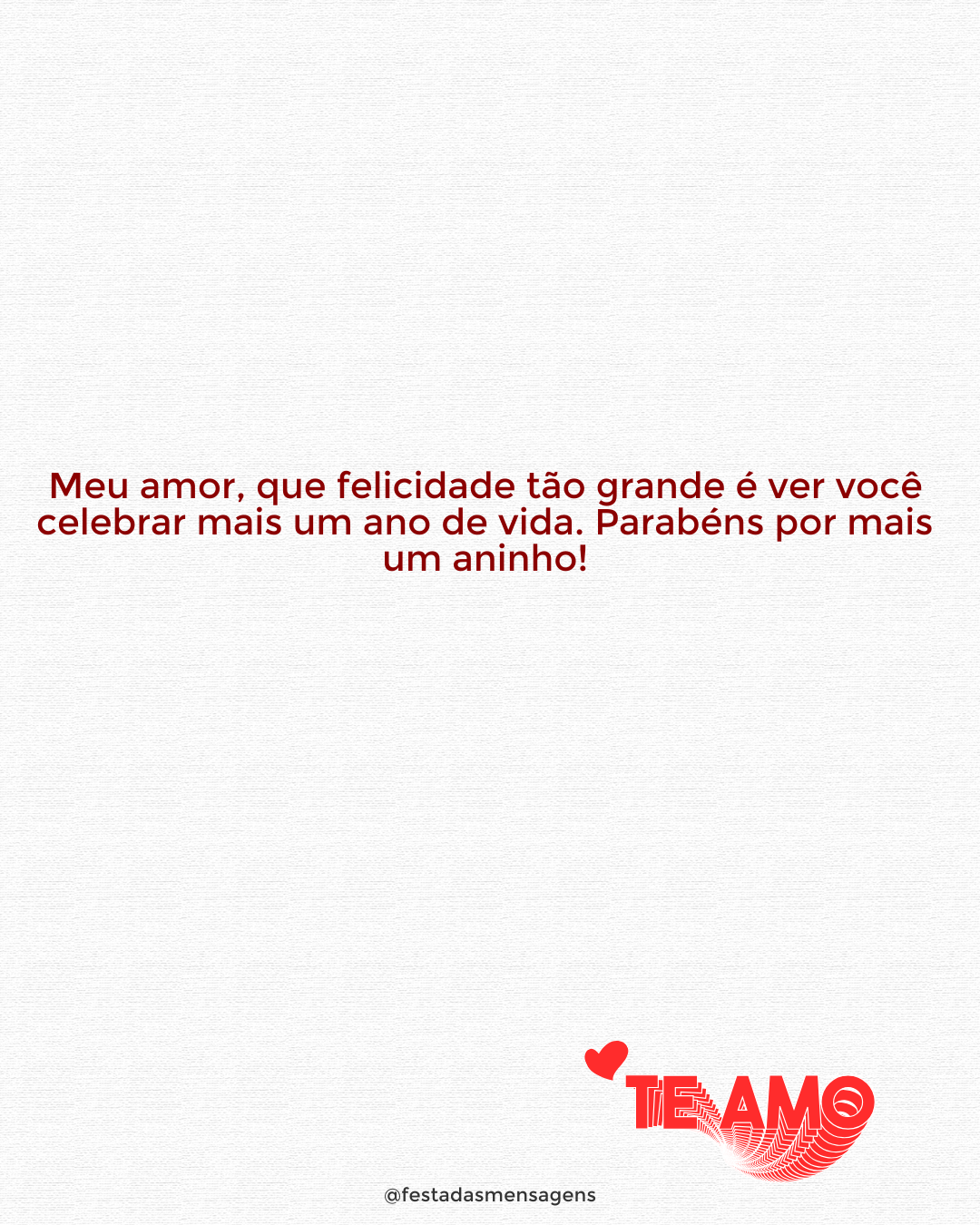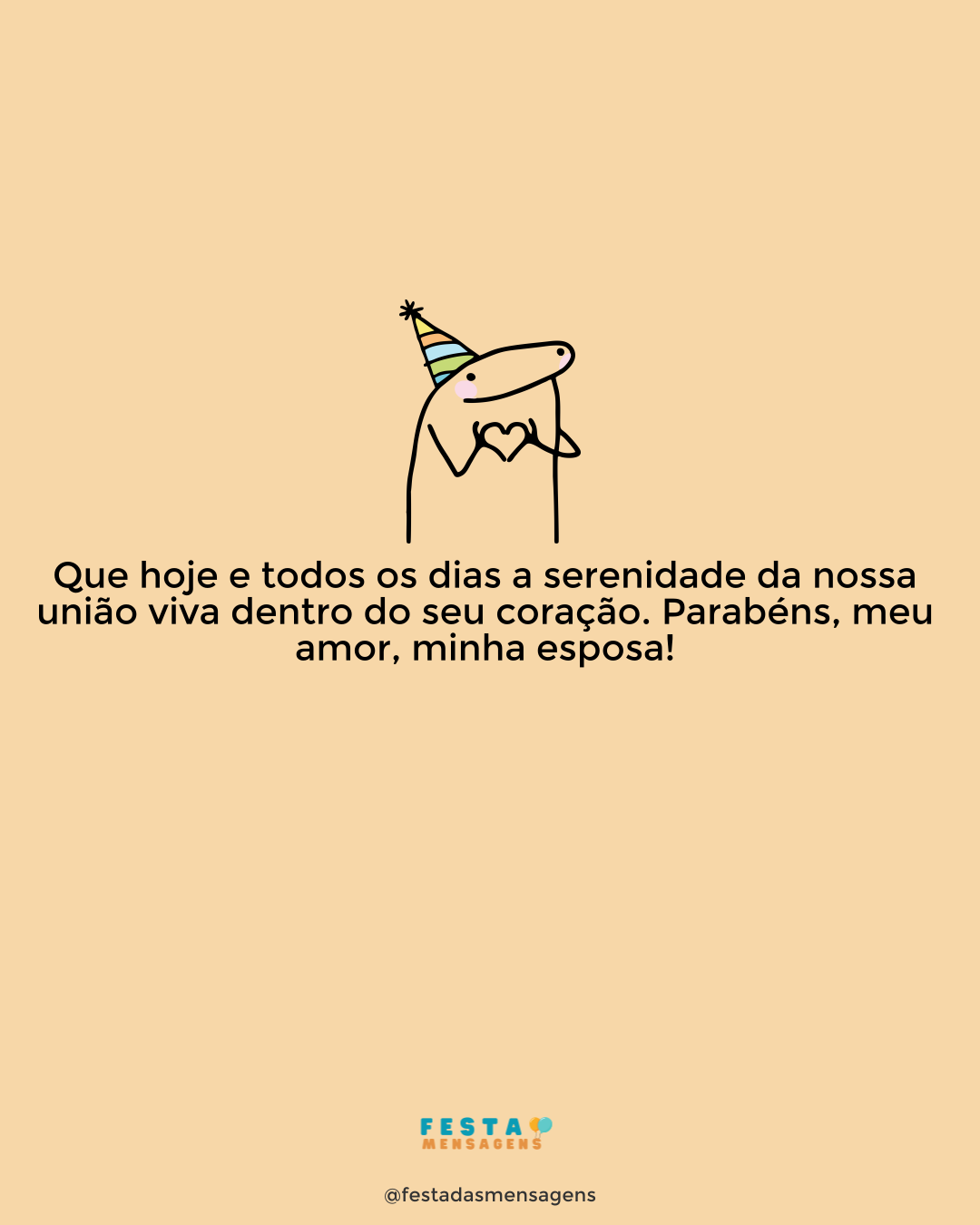 Um ano se passou desde o dia da nossa perfeita e mágica união de amor: o nosso casamento. E como foi maravilhoso esse ano. Parabéns, meu amado marido; a você, a mim, a nós! Parabéns por esse ano, por ser o melhor marido do mundo, por ter sabido, a cada novo dia, colocar nos meus lábios um sorriso diferente e igual de perfeição. Parabéns por fazer de mim a mais feliz das mulheres, por aumentar as minhas alegrias e me amparar nas tristezas. Esse é o primeiro ano, o primeiro de muitos, pois eu apenas desejo que a felicidade deste primeiro ano se repita por toda eternidade. Eu amo você, amo ser quem sou do seu lado, e amo estar ao seu lado!