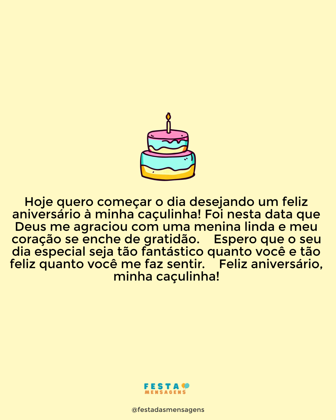Parabéns, filhinha! Que este dia de festa e de celebração dos seus doze anos fique para sempre marcado na sua memória pelos melhores motivos. Feliz aniversário! Você é incrível! Sempre que olho nos seus olhos, sinto uma vontade gigante de a abraçar e agradecer por existir na minha vida. Sou uma pessoa sortuda por ter você como filha! Peço, por favor, que se divirta, que aproveite cada instante com alma e coração. Viva sua vida inteira assim: com intensidade. Ah, e nunca se esqueça que eu estarei sempre ao seu lado, celebrando a vida.