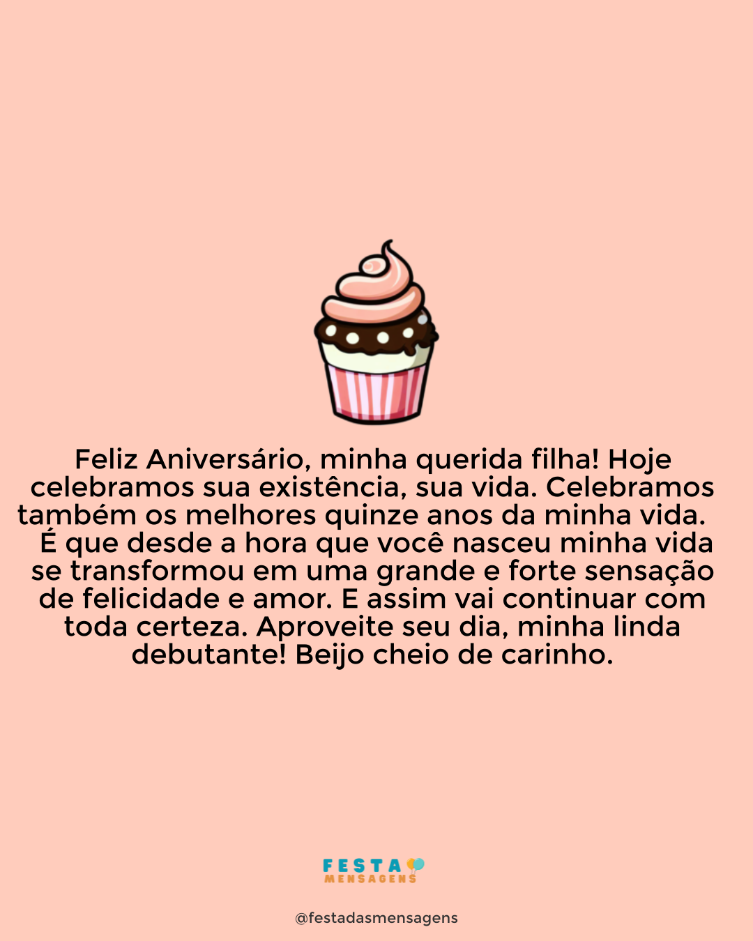 O meu coração de pai se enche de felicidade por ver a minha filha completar 15 anos de vida! É difícil aceitar que se esteja tornando uma mulher e, ainda por cima, uma mulher linda. Só quem for pai de uma menina é que consegue entender isto. Tenho a certeza de que irá partir muitos corações. Tenha um feliz aniversário, minha filha!