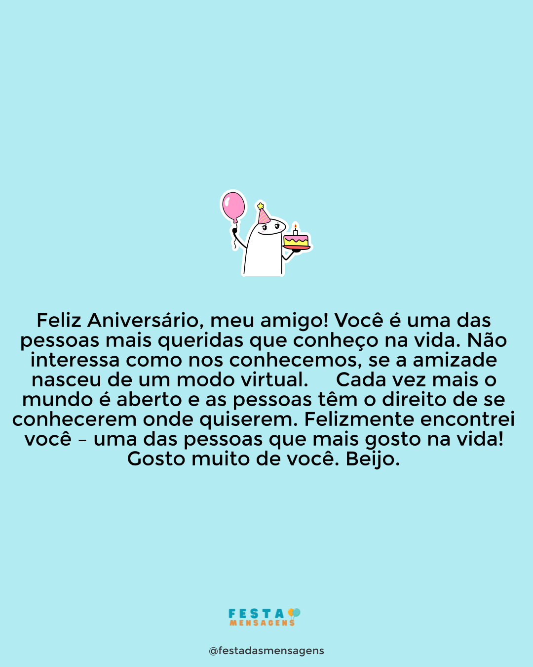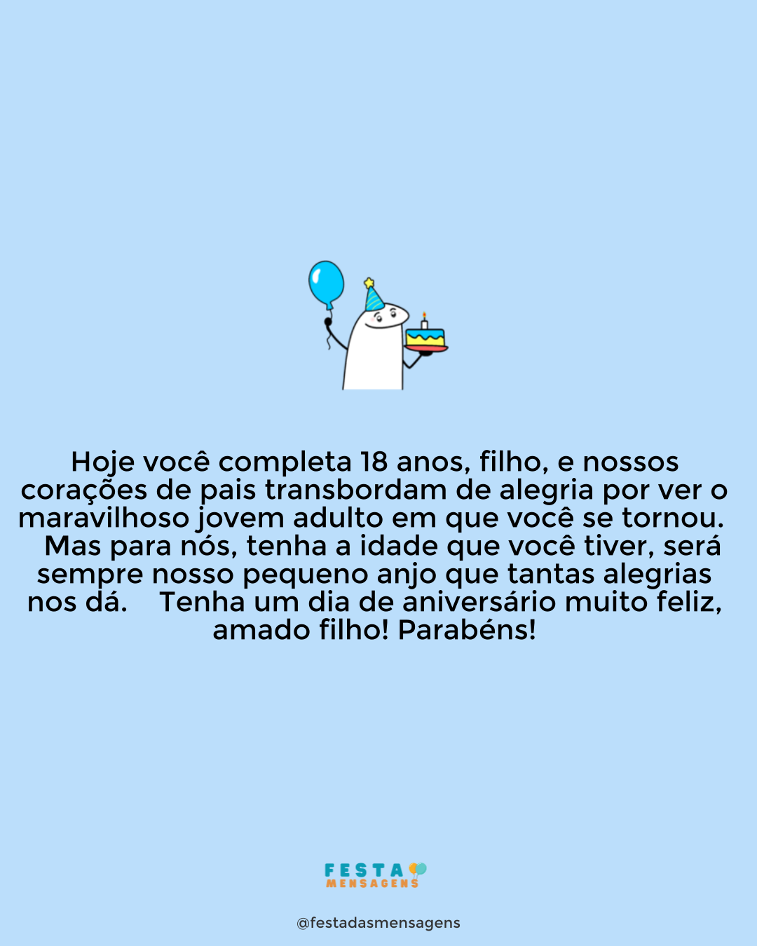 Parabéns, meu filho querido! Você está cada vez maior, cada dia mais adulto. Hoje celebramos mais um ano vivido em grande estilo, com aventuras e experiências sem fim. Aproveite intensamente sua adolescência! As coisas que você aprecia hoje já não são as mesmas de há alguns anos, mas eu continuo a amá-lo com a mesma verdade. Os interesses mudam, as pessoas evoluem: esse é seu caso também, filho. Eu não sei como descrever o que sinto, porque é uma mistura de alegria com nostalgia, de paz por ver você crescer de bem com a vida e também de angústia por não estar sempre junto. Sentir é uma coisa complicada! Só espero e lhe peço, por favor, que nunca se desvie do caminho que considera ser o seu. Divirta-se sempre muito, porque a vida tem de ser aproveitada com alegria e corra atrás de todos seus sonhos. A adolescência é uma coisa bonita. Aproveite-a, filho!