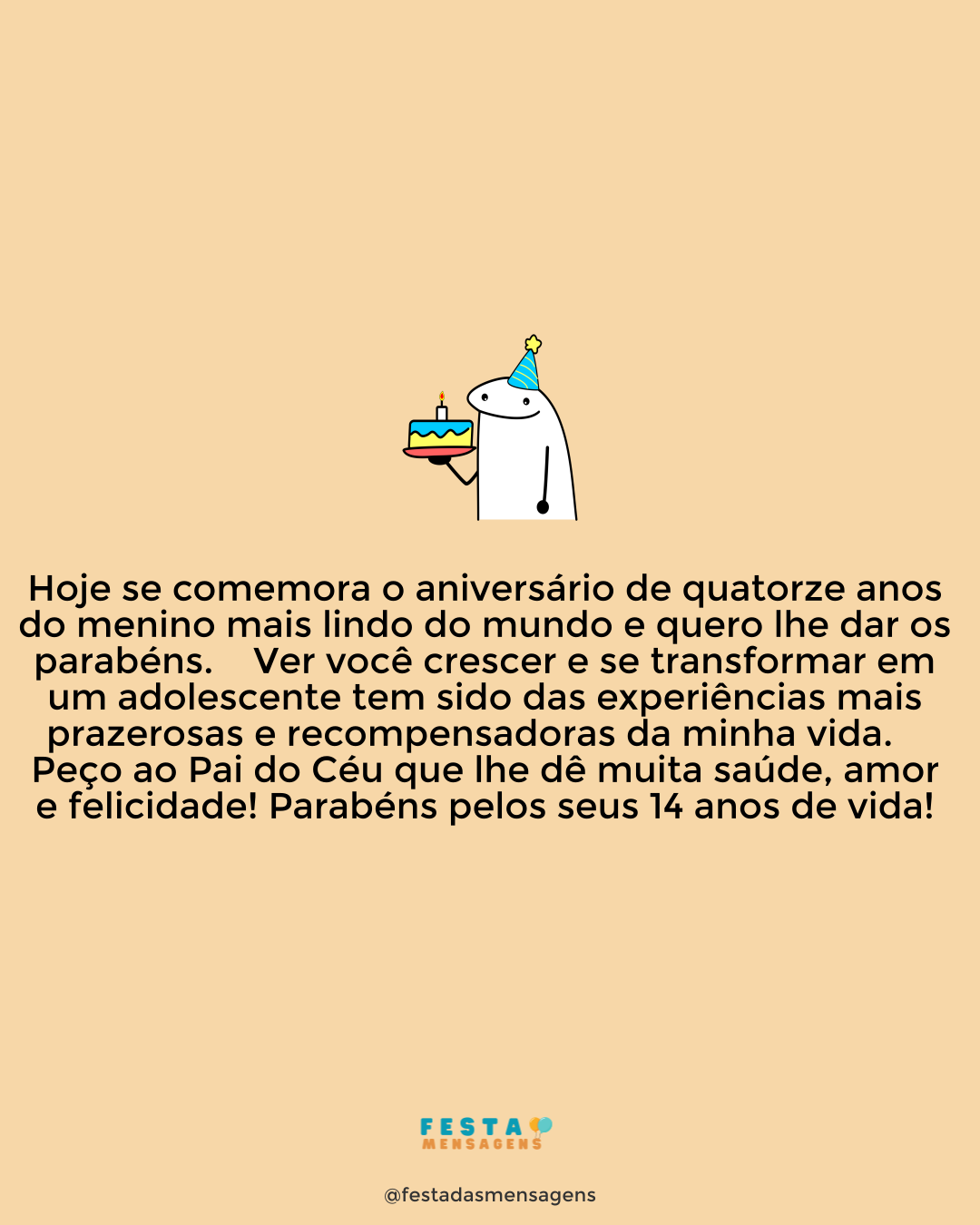 Feliz Aniversário! Este é um dia grandioso, pois o milagre da vida se renova para você em mais um ciclo que começa hoje. Receba essa bênção de Deus com alegria e gratidão, e aproveite a maravilhosa dádiva que é a vida. Faça mais amigos, espalhe o bem e seja feliz. Espero que Deus abençoe você com saúde, paz e amor, e guie sempre seus passos pelo caminho da felicidade. Parabéns e fique na paz do Senhor!
