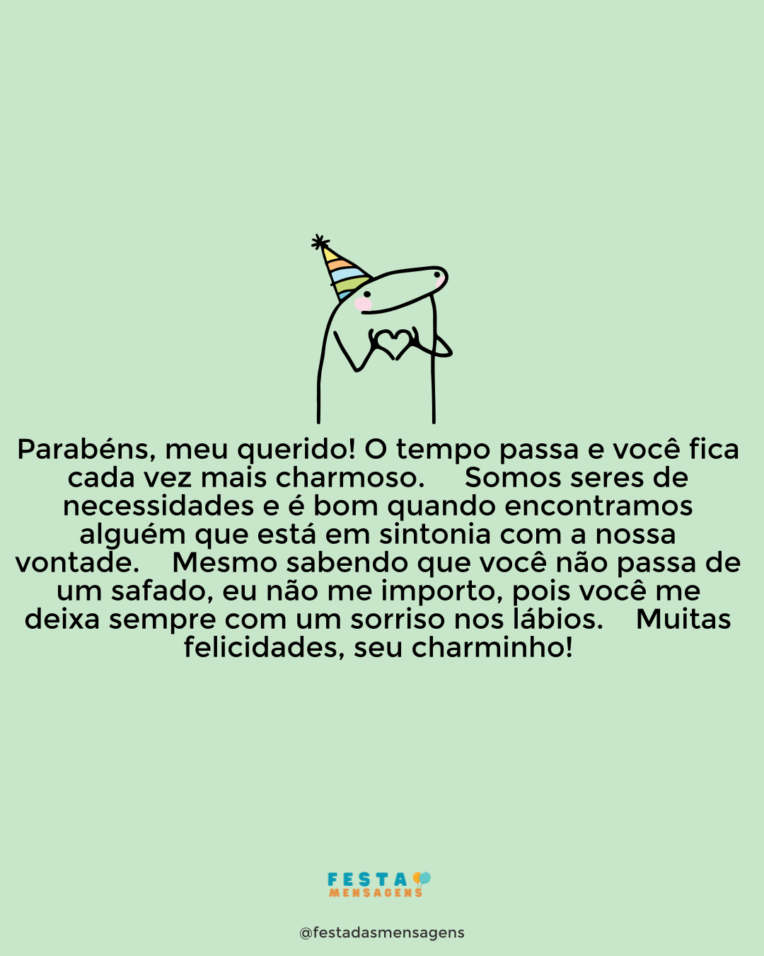 Parabéns! É uma pena termos personalidades tão fortes e que a nossa relação não tenha ido adiante. Somos orgulhosos, ninguém quis dar o braço a torcer, mas o importante é que algo de muito bom permaneceu: a nossa amizade. Não posso negar que você é incomparável e, também, por esse motivo, é o meu ex favorito. Se estivéssemos juntos hoje com certeza íamos dar uma grande festa para comemorar o homem maravilhoso que você é. Como não estamos, faço os meus votos à distância, mas com muito carinho. Espero que você realize os seus sonhos, desfrute o que a vida tem de melhor e seja muito feliz. Feliz aniversário!