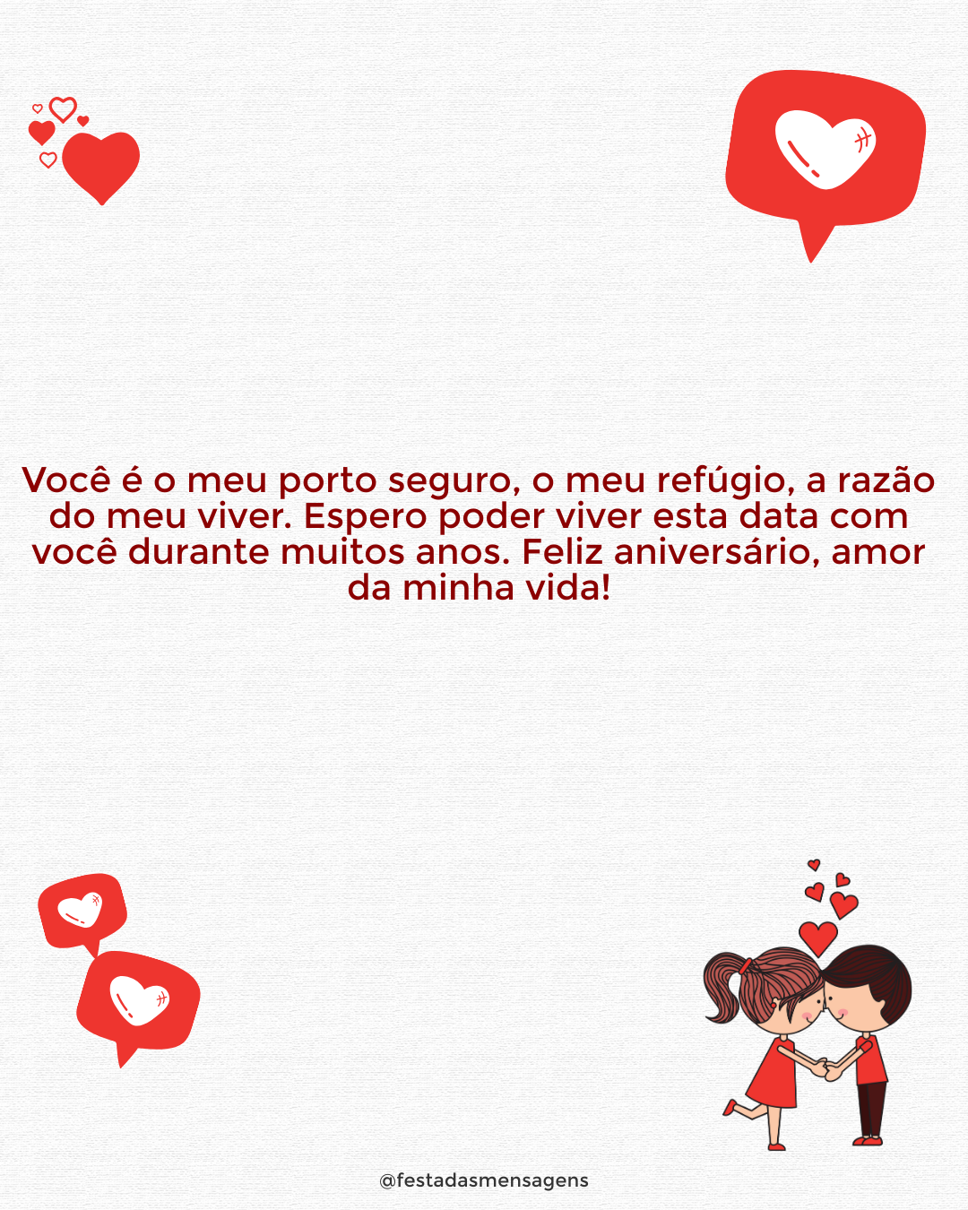 Feliz Aniversário, Amor! Você é o melhor que aconteceu em toda a minha vida! Nunca imaginei sequer ter junto a mim um ser tão maravilhoso e encantador quanto você. Seu jeito carinhoso, sua atenção e preocupação com nosso casamento, sua maturidade. Você faz com que tudo valha a pena, sabe? Sinto que todos os dias devo demonstrar minha felicidade para todo mundo, a toda a hora! Você será sempre a mulher de meu coração. Obrigado por tornar meu mundo bem mais belo, meu bem!