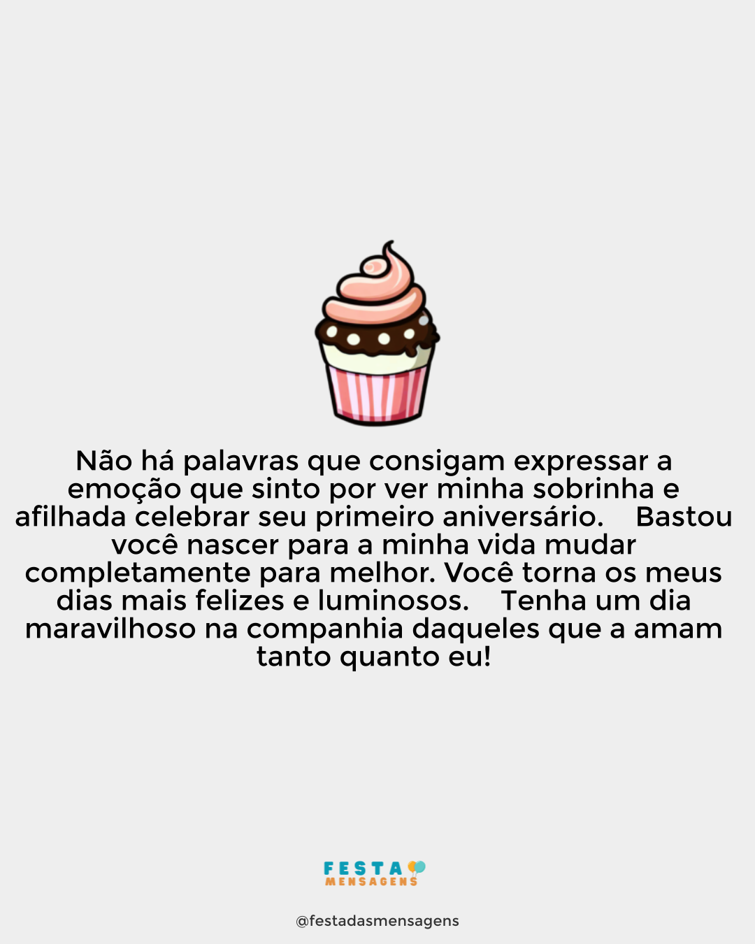 Querida neta, este dia fica marcado pela distância que separa, mas também, aliás, acima de tudo, pelo amor que nos une. Feliz aniversário, meu bem! Desejo que no próximo ano façamos uma festa bem diferente, em que minhas mãos possam sentir a suavidade do seu cabelo, a delicada pele do seu rosto. No próximo ano estaremos todos juntos! Não é fácil estar longe quando queremos estar perto, quando só queremos estar em determinado lugar e não é possível. Mas é também assim que evoluímos, que ficamos mais fortes e preparados. Continuemos nossa luta, querida. Aproveite muito, muito seu grande dia! Parabéns!