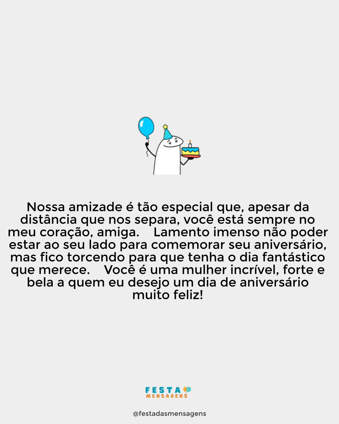 Querida amiga, parabéns! Somos amigas faz tanto e quase que sinto que você nasceu comigo. É uma sensação absolutamente incrível, porque desde que nos conhecemos nos tempos de escola, nunca mais nos separamos. Nossa amizade é verdadeira e eterna, e eu sinto um orgulho muito grande nela. Pode ter certeza que estou muito emocionada por comemorar mais um aniversário ao seu lado. É que não é preciso estar colada a você para estar junto. Isso é mágico e rico, é de ouro. A celebração da sua vida deve ser feita todos os dias e a toda a hora, porém nem sempre ligamos para essas coisas que parecem pormenores, mas são fundamentais porque você é isso mesmo: fundamental para mim e para todo mundo. Por isso, peço a Deus que lhe ofereça um dia cheio de alegria e de amor como sinal de recompensa por tudo que você é para seu semelhante. Para mim, você é muito. Não há amiga como você nem amizade como a nossa. Feliz aniversário!