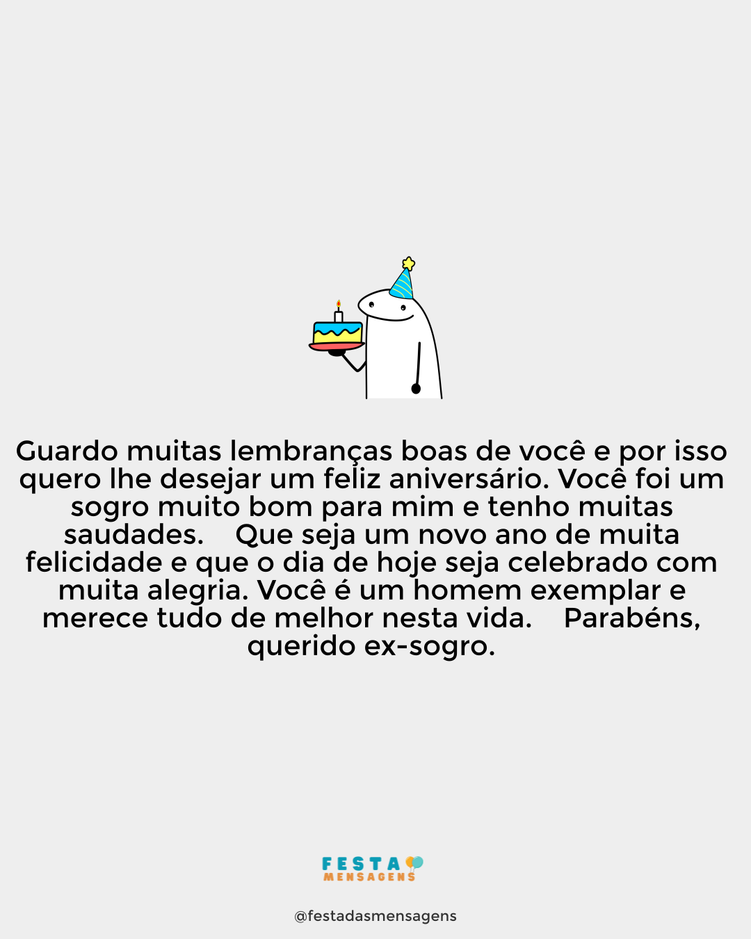Mesmo fazendo parte da família há tantos anos, faço questão de desejar, no dia do seu aniversário, toda a felicidade do mundo! Você é uma pessoa incrível que tenho prazer que faça parte da minha vida. Espero que este ano seja ainda melhor que os passados, e que os seus maiores desejos possam ser realizados. Que você tenha sempre muita saúde, paz, alegria e dinheiro no bolso, que também é muito importante. Que a sua gargalhada possa nos divertir ainda por muitos anos, e que a sua felicidade seja tão grande que possa ser vista de uma longa distância. Curta bastante o dia de hoje, recebendo de braços abertos o carinho daqueles que o amam e deixando para trás tudo que não transmitir positividade. Tenha um feliz aniversário e um ótimo dia, meu genro, você merece todos estes momentos de alegria! Parabéns!
