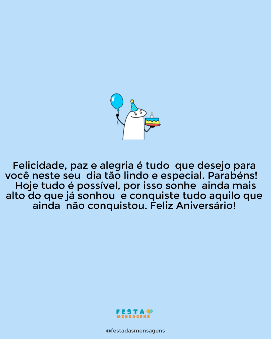 Concretize todos seus sonhos e torne-se uma pessoa realizada e repleta de alegria no coração e paz na alma. Feliz Aniversário! Que não faltem razões para se sentir feliz e em harmonia com o mundo e todas as pessoas. Parabéns!