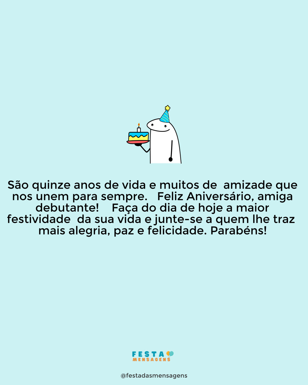 Feliz Aniversário! Este é um dia grandioso, pois o milagre da vida se renova para você em mais um ciclo que começa hoje. Receba essa bênção de Deus com alegria e gratidão, e aproveite a maravilhosa dádiva que é a vida. Faça mais amigos, espalhe o bem e seja feliz. Espero que Deus abençoe você com saúde, paz e amor, e guie sempre seus passos pelo caminho da felicidade. Parabéns e fique na paz do Senhor!