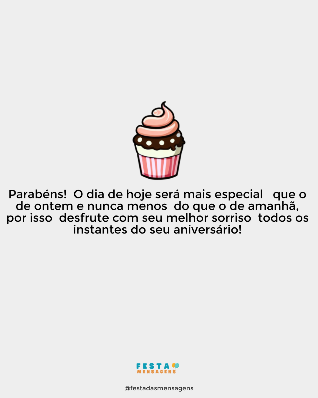 Porque a alegria é reflexo das atitudes no dia a dia, você já conquistou o direito de ser feliz por mérito próprio. Parabéns! Tenha um aniversário cheio de surpresas maravilhosas junto de todas as pessoas da sua vida!