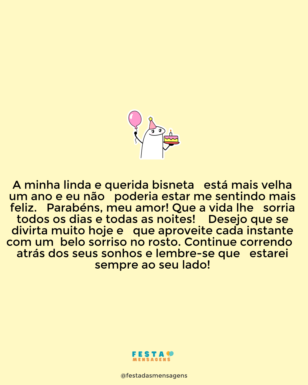 Que a fé e o amor guiem você por onde for. Vejo você completar mais um ano e me emociono, netinha. Que Deus abençoe você com felicidade e paz. Saiba que você está sempre nas minhas preces e oro sempre pelo seu sucesso. Que este aniversário seja como um renascimento, para renovar as energias e trazer bons frutos para a sua vida. - Seja sempre feliz e saiba que eu amo muito você, netinha. Felicidades!